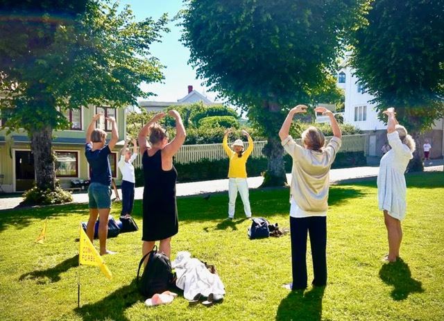 美展期间,法轮功学员在艺术馆附近的天堂公园(The Paradise Park)免费教功,许多人学炼了功法动作。