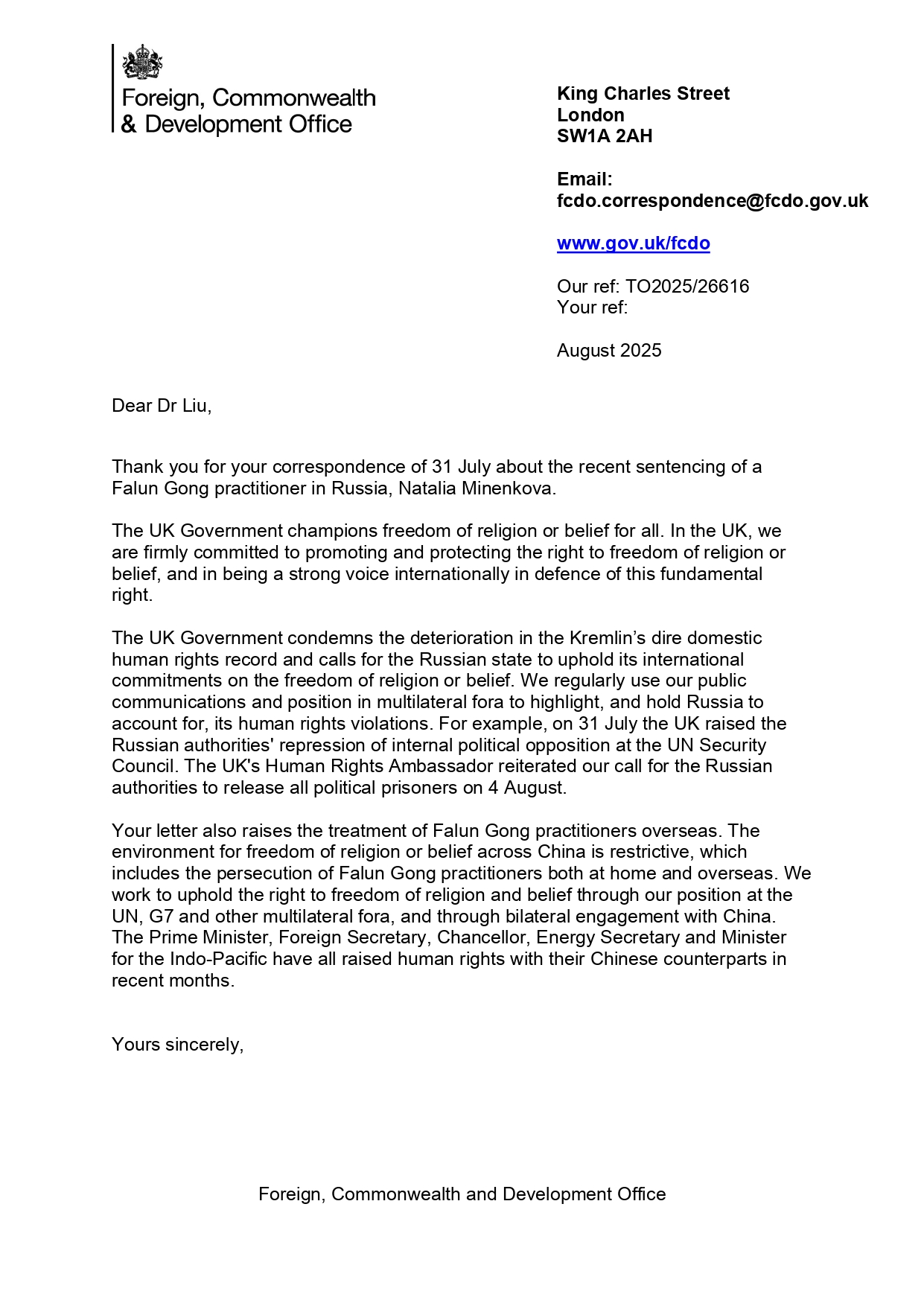 ![]() 图1:二零二五年八月十五日,英国外交部回信英国法轮大法学会。 |