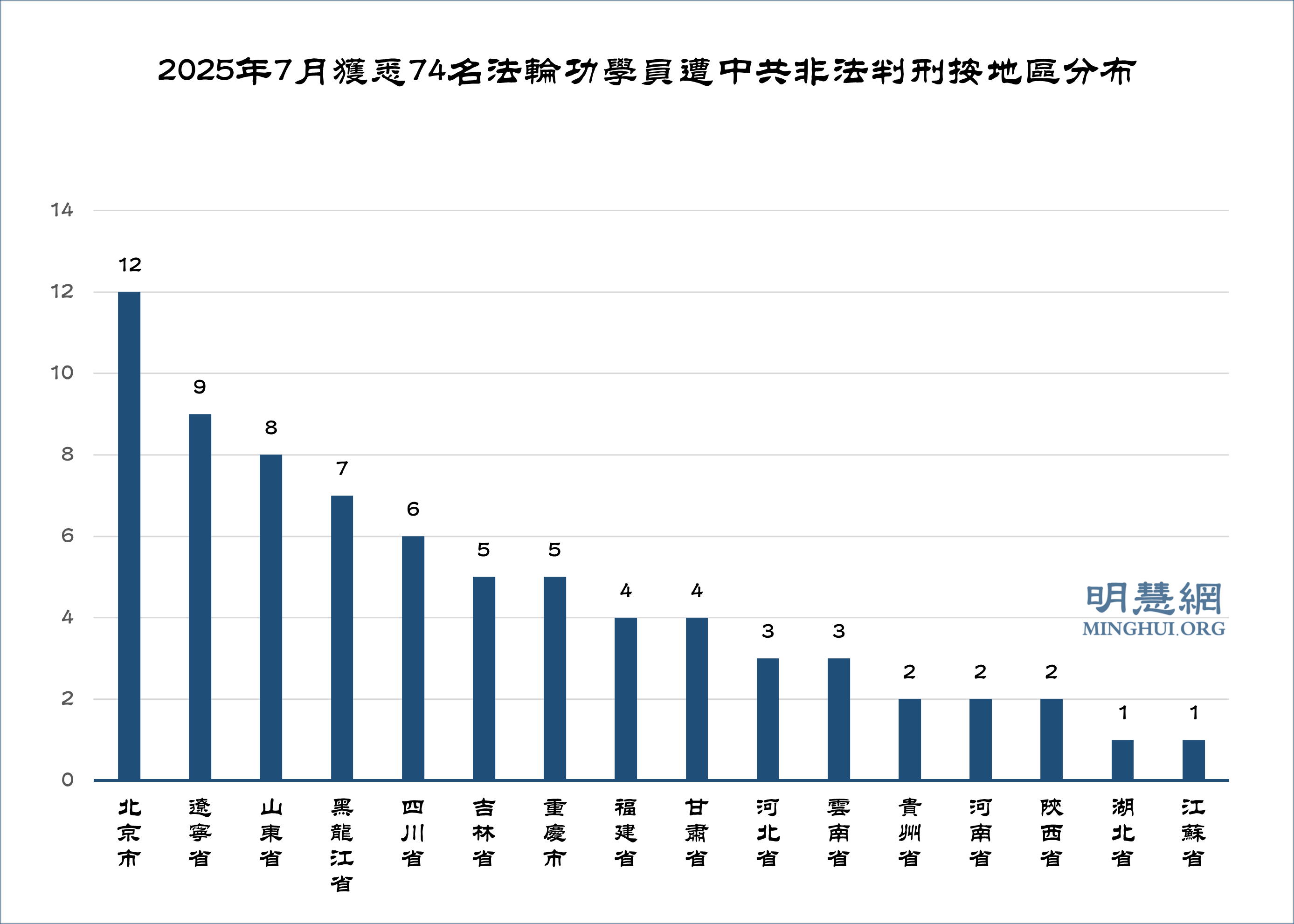 据明慧网报道统计,七月份获知又有至少74名法轮功学员被非法判刑(其中,2025年33人,2024年7人,2023年4人,2022年4人,2021年6人,2020年3人,其他年份17人。),非法判刑分布于中国大陆的十六个省、自治区、直辖市。其中,非法判刑最严重地区依次为:北京市12人,辽宁省9人,山东省8人,黑龙江省7人,四川省6人,吉林省、重庆市各5人,福建省、甘肃省各4人,河北省、云南省各3人。