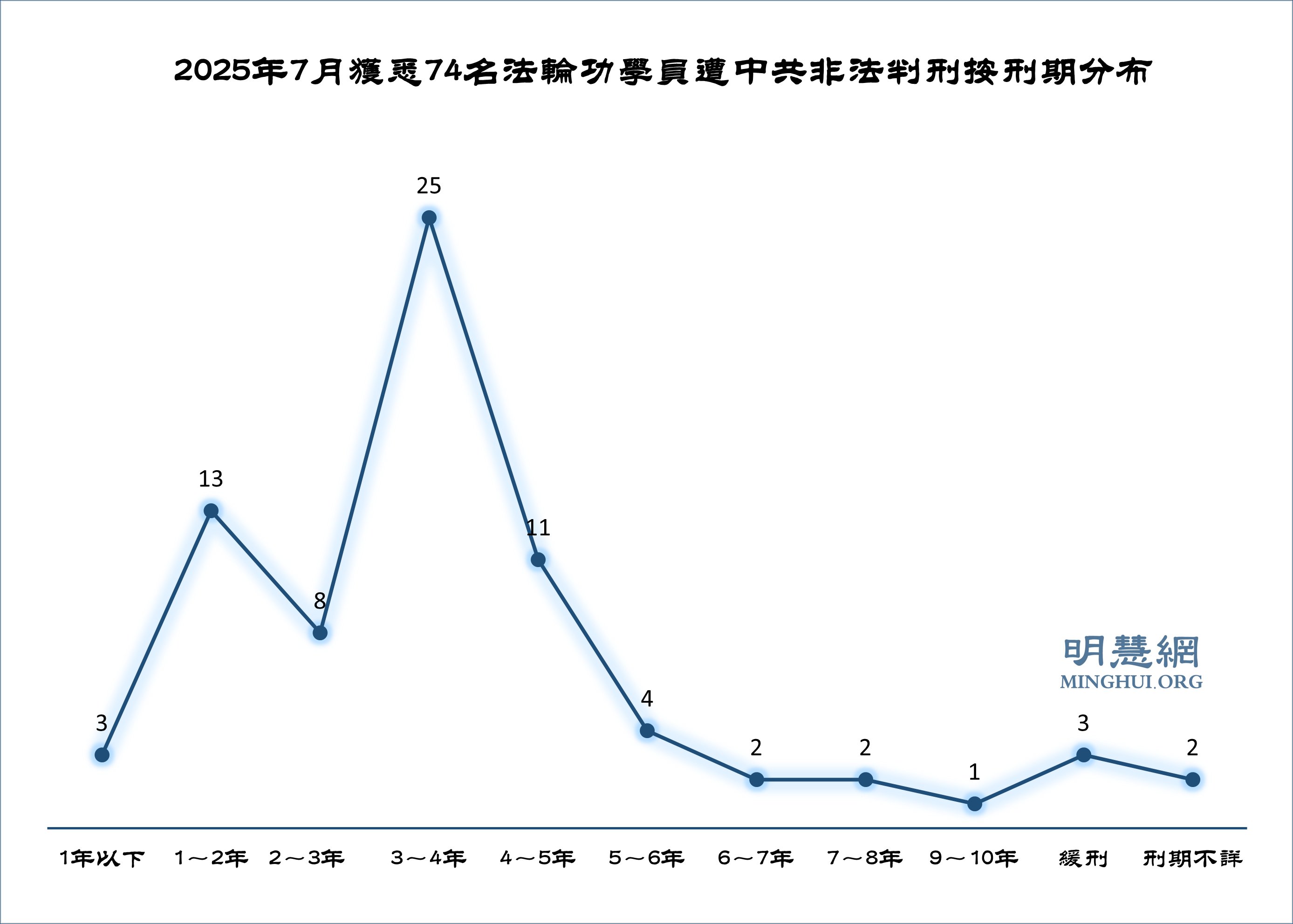 ![]() 图2:2025年7月获悉74名法轮功学员遭中共非法判刑按刑期分布 |