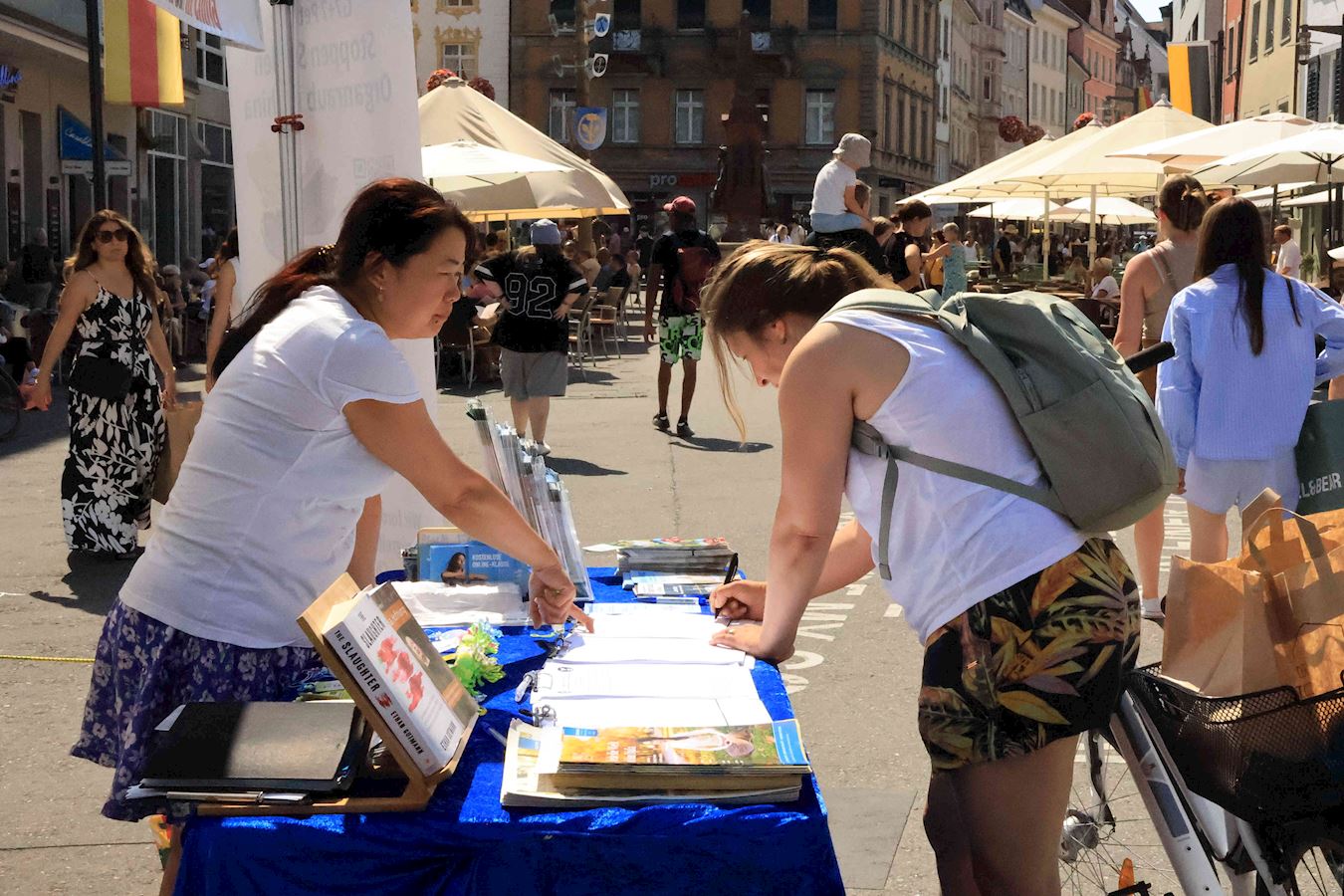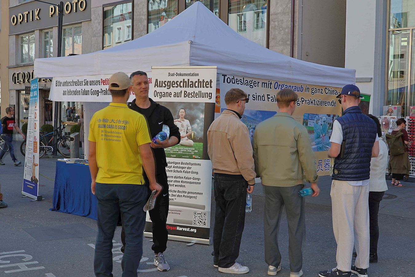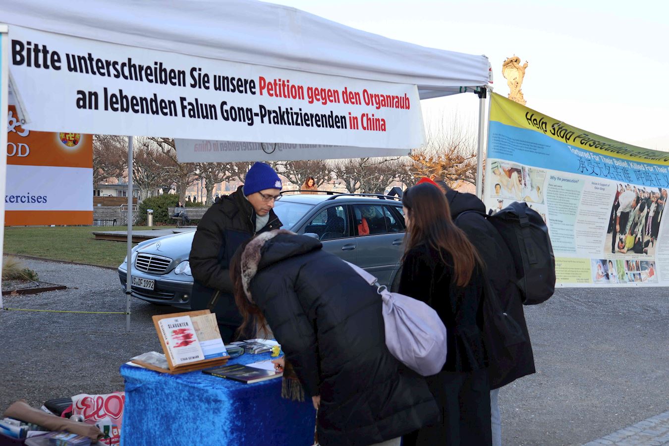 每隔一周的周六,很多经过康斯坦茨渡船码头及市中心马克特广场(Marktstätte)的路人,远远地就能看到一个白色帐篷,侧面的横幅上图片触目惊心,并醒目的写着:“中共活体摘取法轮功学员器官”,帐篷正面的上方写着:请大家签名支持制止在中国发生的活摘法轮功学员器官的罪行。半年来,每次活动都有路人第一次听闻法轮大法,他们与学员交谈,了解更多讯息,并签名要求制止中共迫害法轮功学员,特别是活摘法轮功学员器官的惊天罪恶。