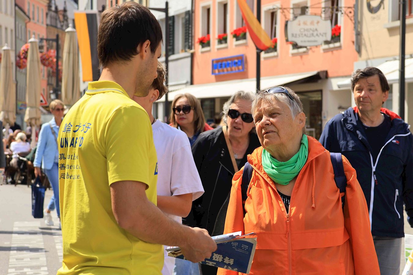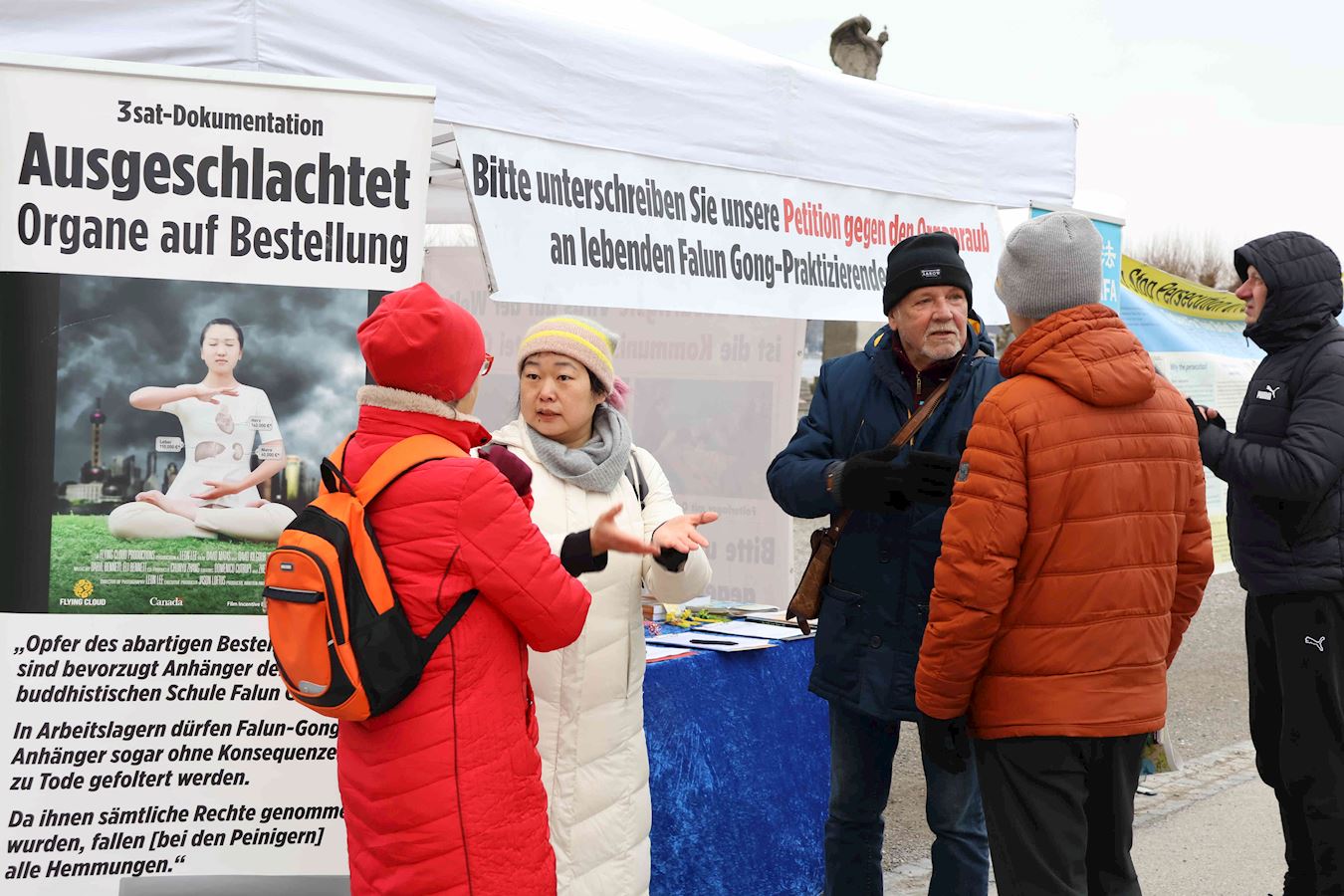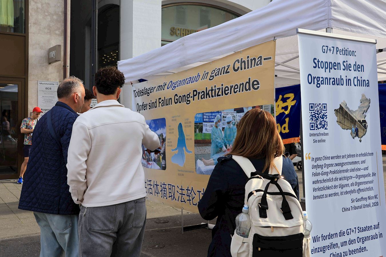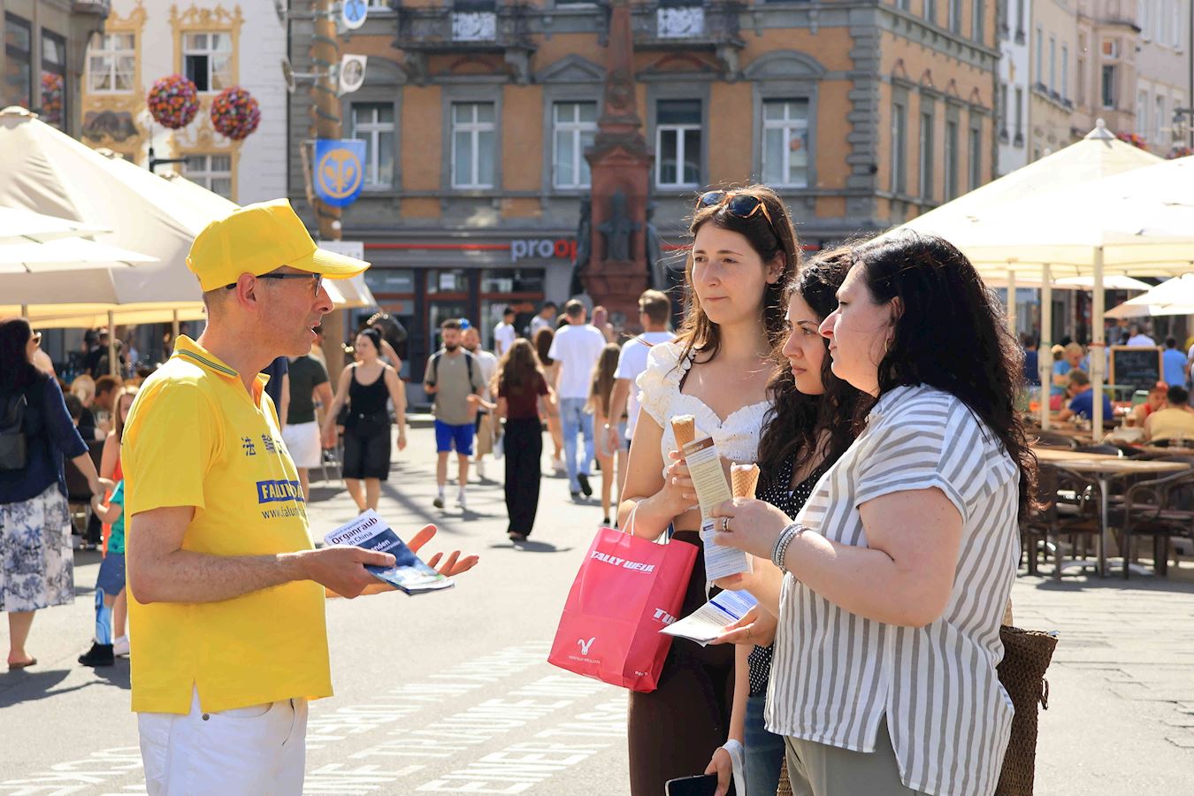 每隔一周的周六,很多经过康斯坦茨渡船码头及市中心马克特广场(Marktstätte)的路人,远远地就能看到一个白色帐篷,侧面的横幅上图片触目惊心,并醒目的写着:“中共活体摘取法轮功学员器官”,帐篷正面的上方写着:请大家签名支持制止在中国发生的活摘法轮功学员器官的罪行。半年来,每次活动都有路人第一次听闻法轮大法,他们与学员交谈,了解更多讯息,并签名要求制止中共迫害法轮功学员,特别是活摘法轮功学员器官的惊天罪恶。