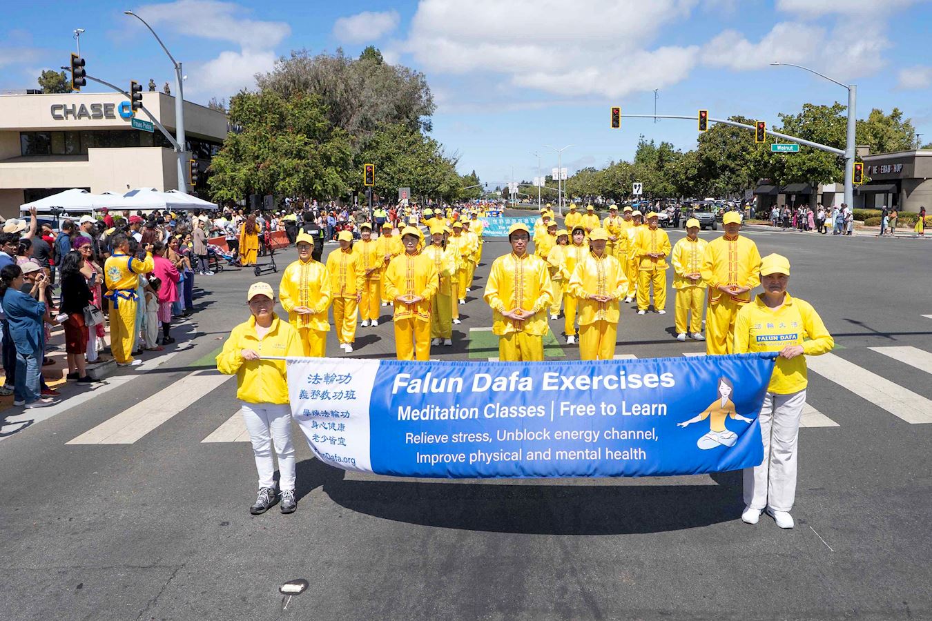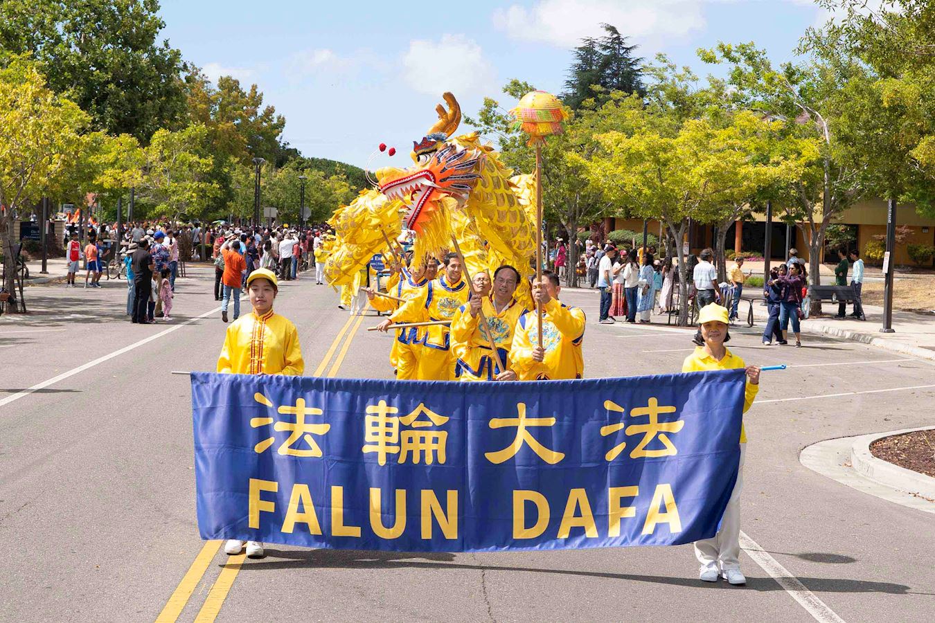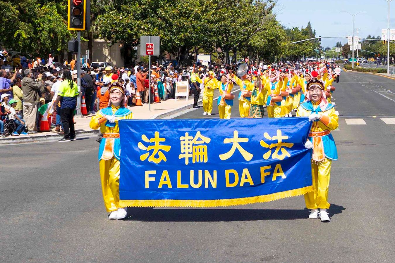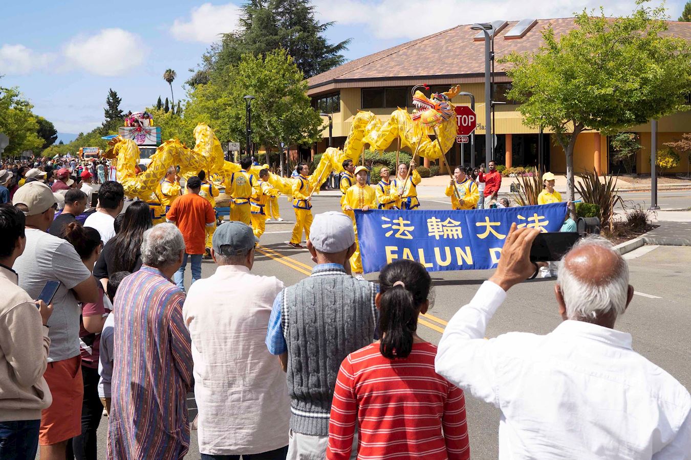 今年参加游行的法轮功学员队伍有炼功队、舞龙队和腰鼓队,是历年来阵容最大的。游行中,许多观众为法轮功学员的队伍加油、鼓掌、竖大拇指。结束后,法轮功学员还在舞台上为观众演示法轮功五套功法。