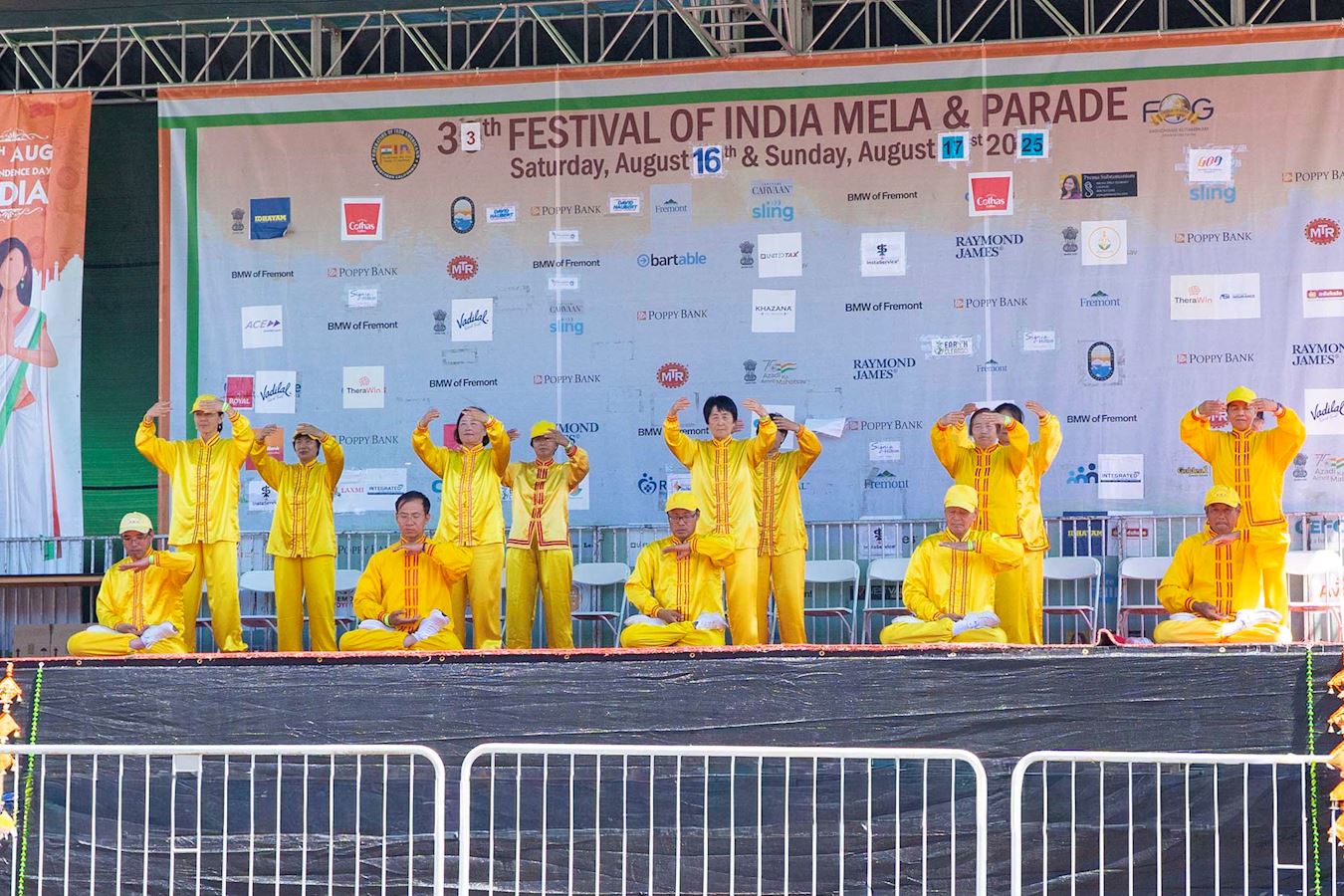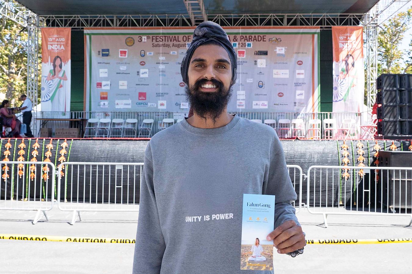 法轮功学员开始在舞台上展示功法时,瑜伽教师奥兰迪普(Aurandeep)坐到了舞台前的第一排正中间的座位,当他听到法轮功学员介绍法轮功的原则是真、善、忍时,他开始鼓起掌来,法轮功学员的功法示范结束时,他双手高高的举过头鼓掌。