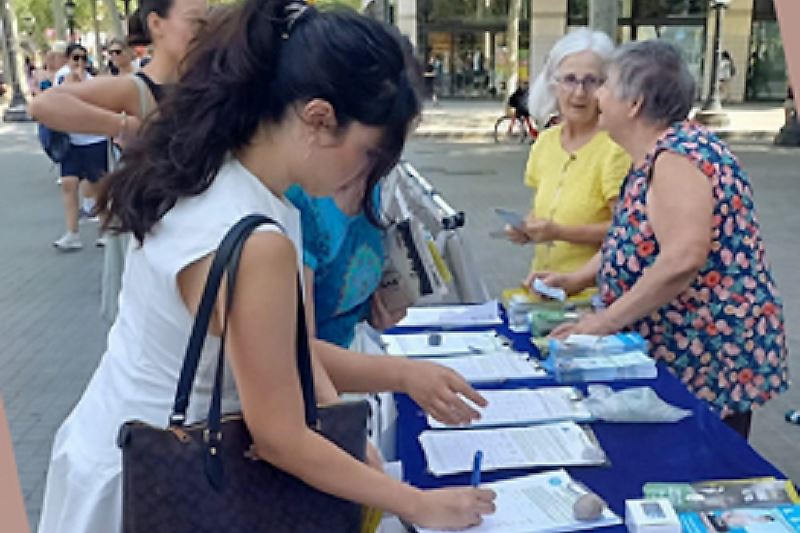 七月十九日下午,巴塞罗那法轮功学员在卡达卢西亚(plaza Catalunya)广场举行反迫害征签活动,呼吁中共必须遵守《人权宪章》中关于宗教与精神信仰权利的规定,立即停止迫害法轮功学员的残暴行径,停止活摘器官。