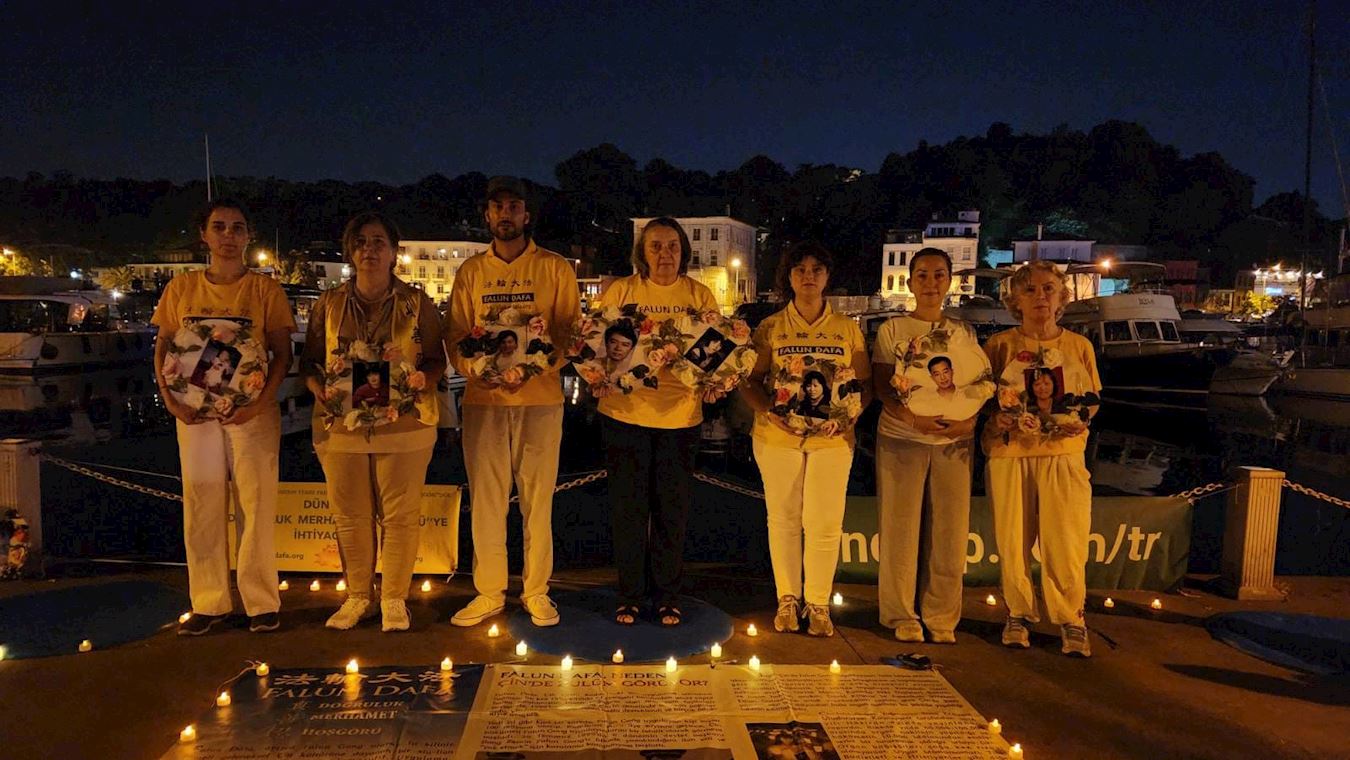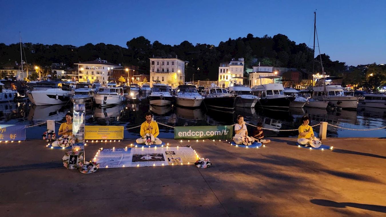七月二十日晚上,法轮功学员在中共驻伊斯坦布尔领事馆对面的海滩上举行了烛光夜悼活动。