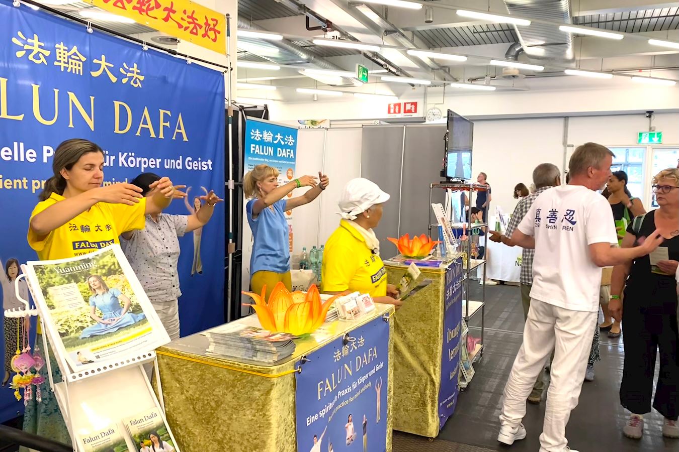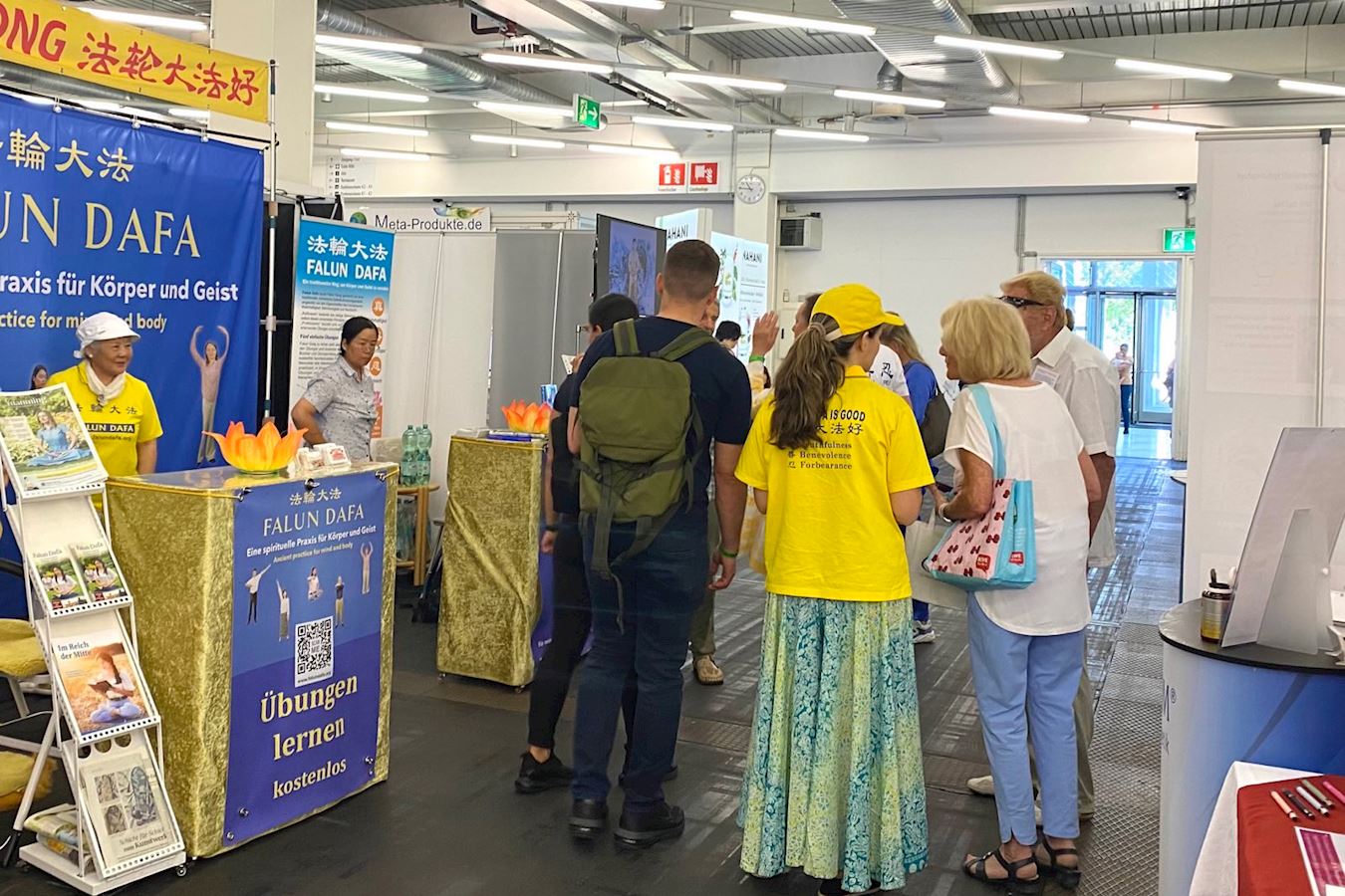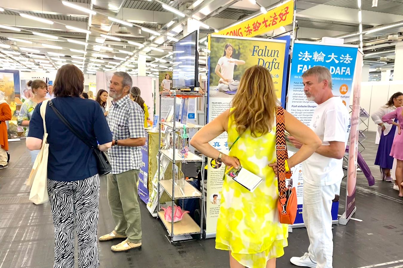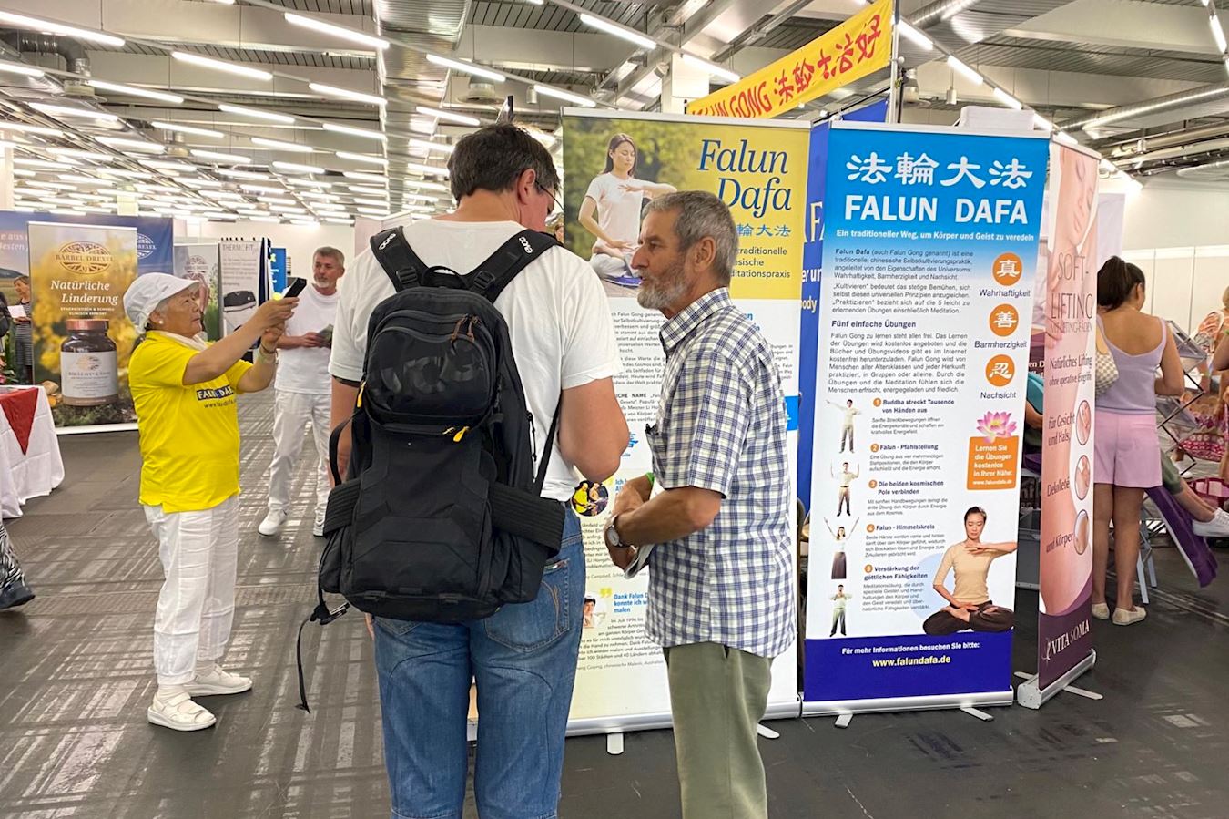 当天法轮功学员哈拉德(Harald)跟很多参展者交谈,其中一位来自德国巴伐利亚的女士曾在菲森(Füssen)看过神韵。在看神韵过程中,她感觉到身体有种能量。在这里,她再次感受到了同样的能量。她还对学员传递的法轮大法信息表示感谢。