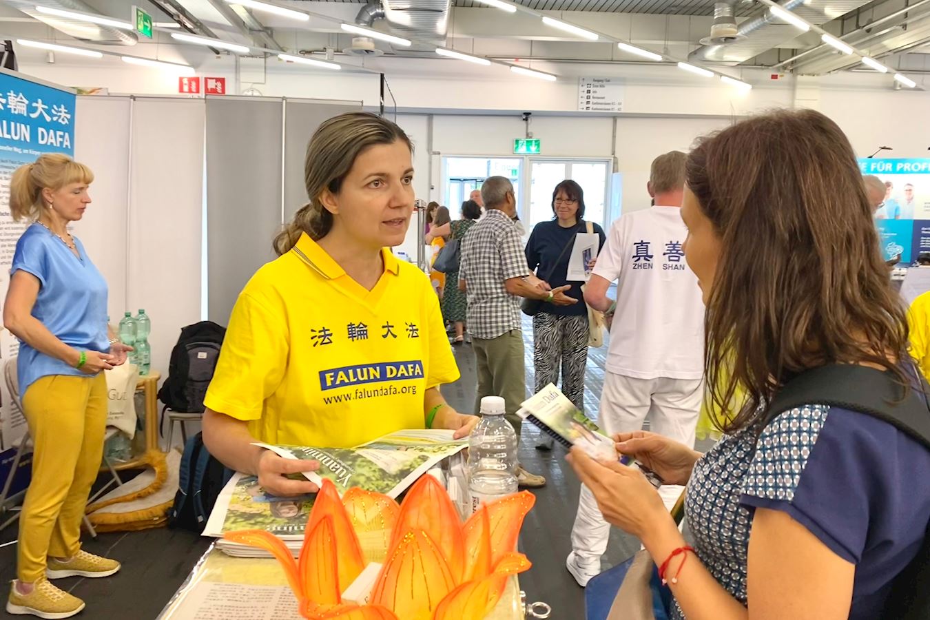 一位曾在中国学习传统医学的德国女士告诉法轮功学员,中国正日益成为绝对监控民众的国家,如今,没有摄像头的地方已不复存在,因此她不再前往中国。这位女士很感激能与学员交谈,并对法轮功很着迷,表示会在博览会期间她自己的研讨会上推荐法轮功。
