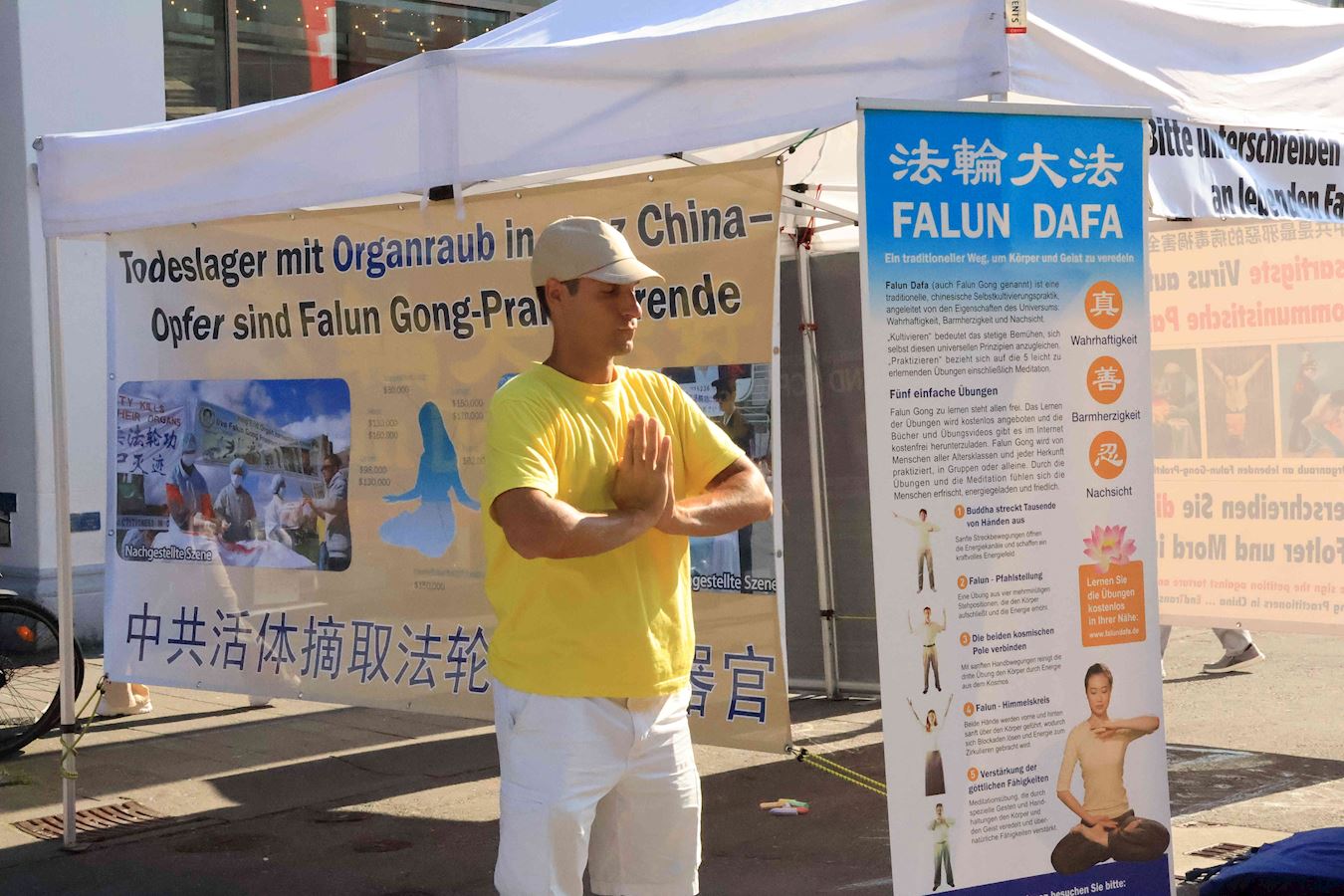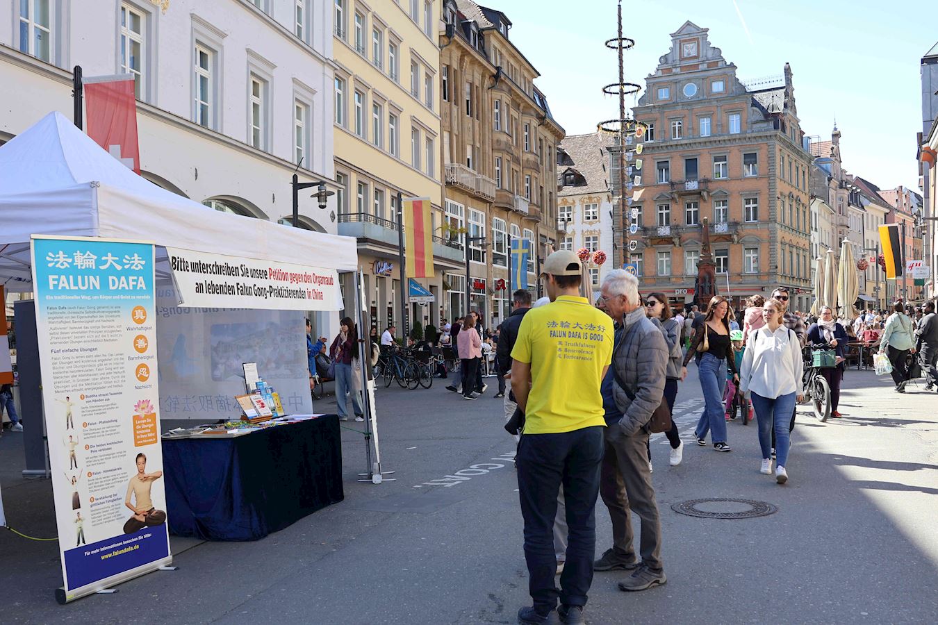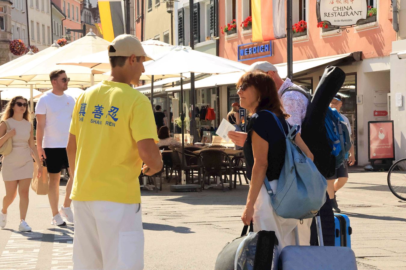 二零二五年二月至七月的十五个周六,来自德国和瑞士的法轮功学员先后在康斯坦茨的轮渡码头及市中心马克特广场(Marktstätte)设立展位讲述法轮功的真相,很多人在得知中共残忍迫害法轮功二十六年之久,甚至活摘法轮功学员器官的罪恶后,纷纷签名希望共同制止中共的反人类罪行。