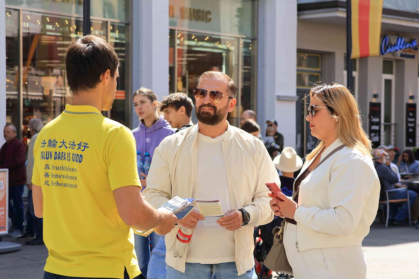不少当地市民和来自各国的游客也非常想了解法轮大法是什么。学员们告诉他们,法轮大法教人按照真、善、忍生活,做个好人。比如法轮功学员会在日常生活工作中为别人着想,努力做到先他后我,遇到矛盾时会先查看自己的问题,而不是与对方争执。同时辅以缓慢易学的功法,让人身心受益。