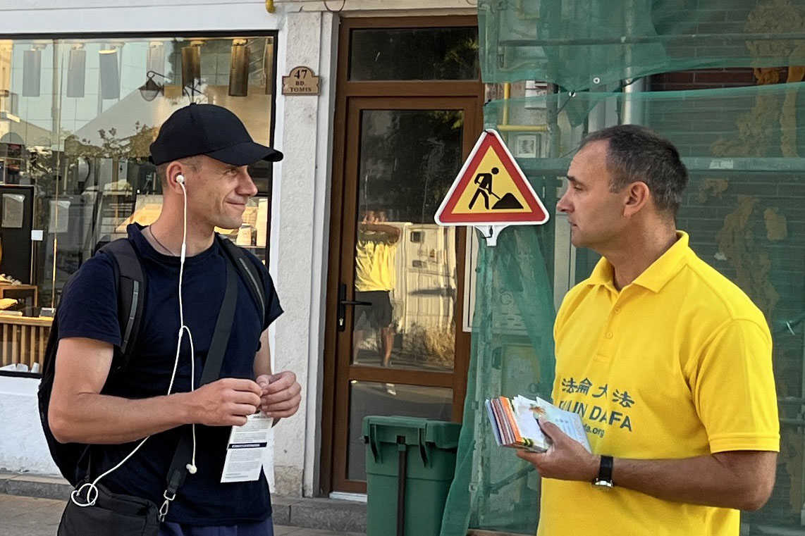 ![]() 图8:二零二五年八月十二日在康斯坦察,高中生大卫(右)表示,(法轮大法)教导的原则非常好,每个人都应该尝试一下。 |