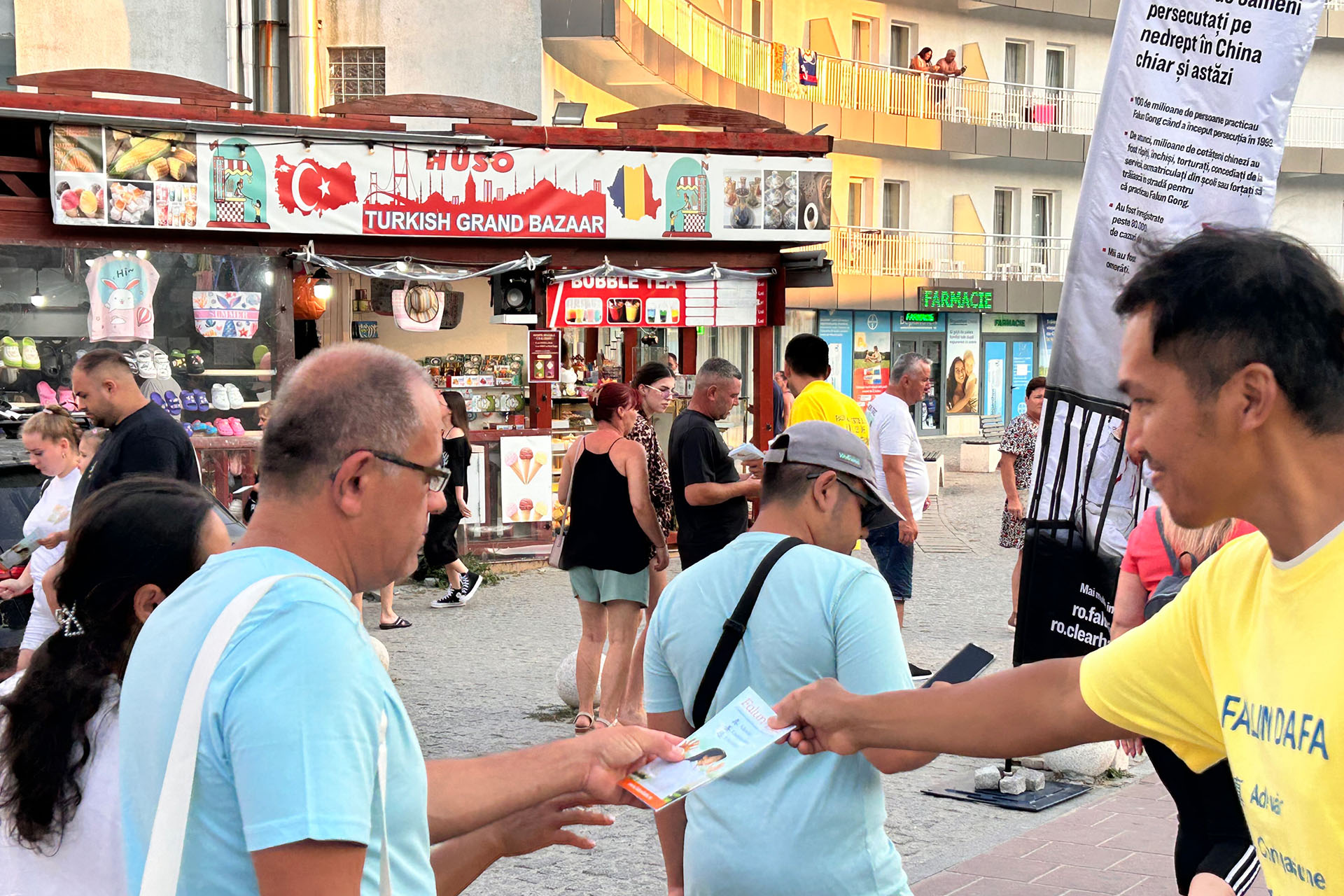 ![]() 图3:二零二五年八月十一日,罗马尼亚法轮功学员在北埃福列举办信息日活动,很多民众驻足了解真相。 |