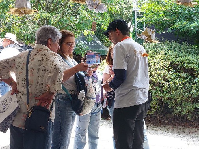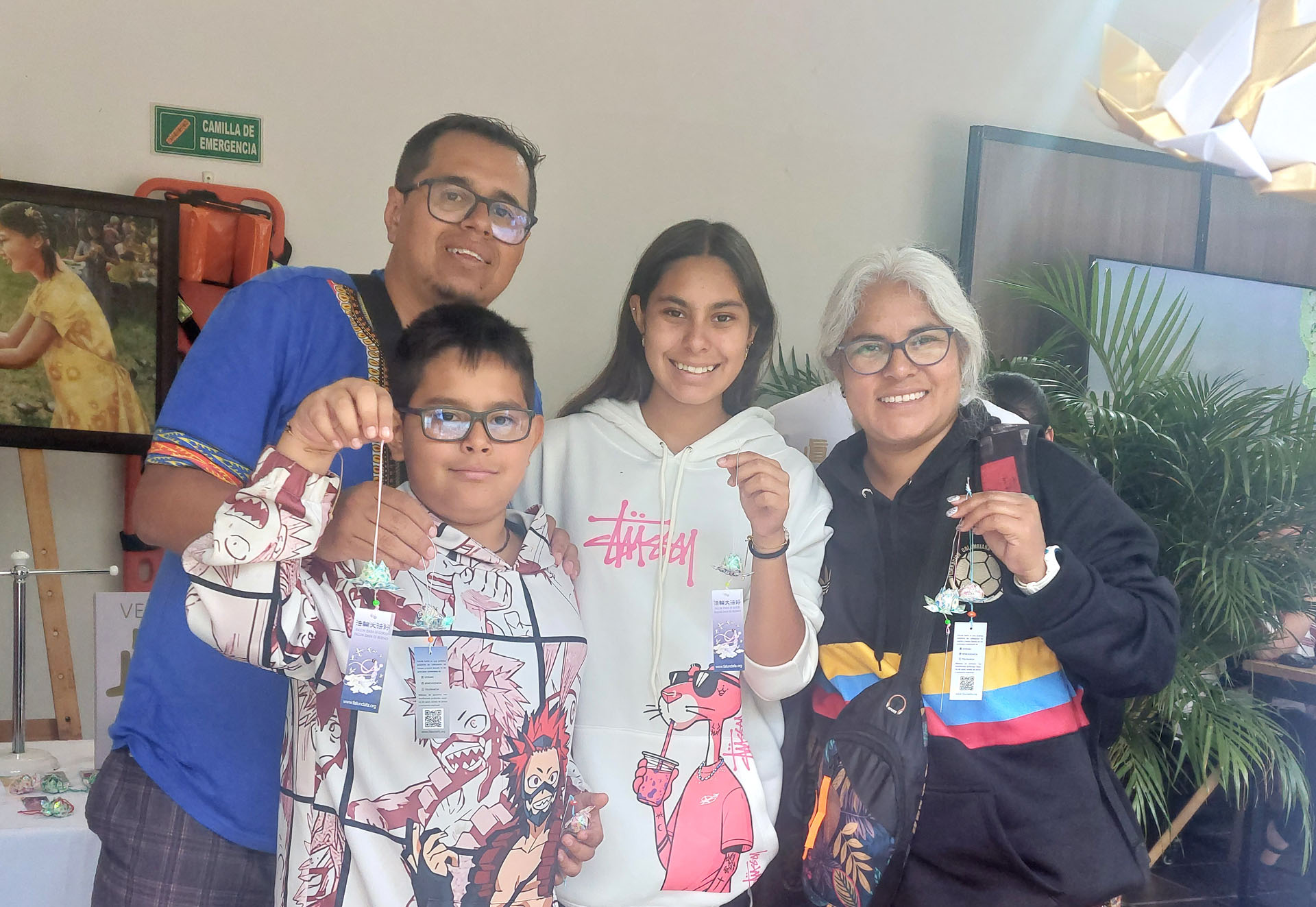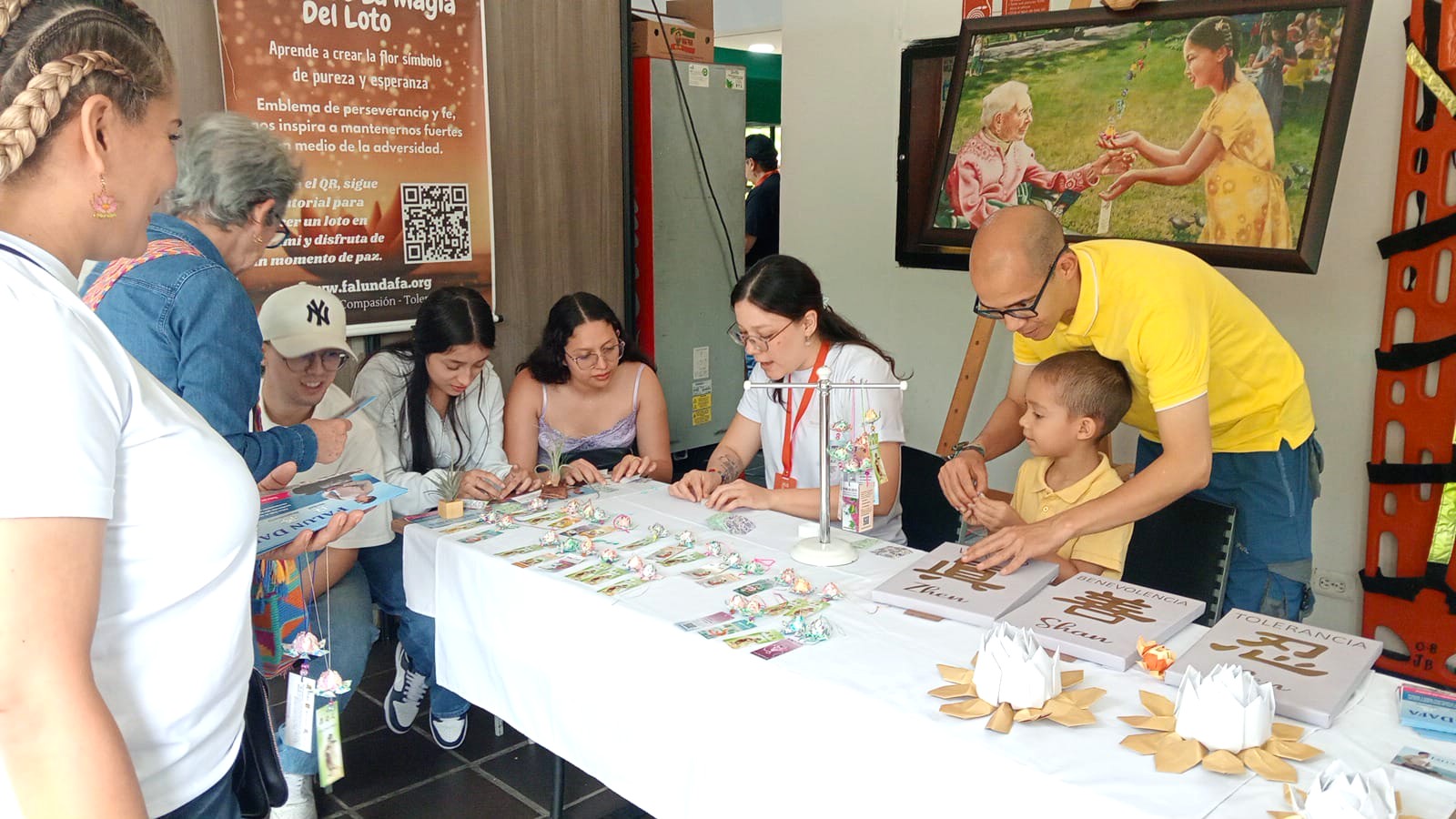 一户来自墨西哥的四口之家在麦德林旅游时,来到展位了解法轮大法真相。