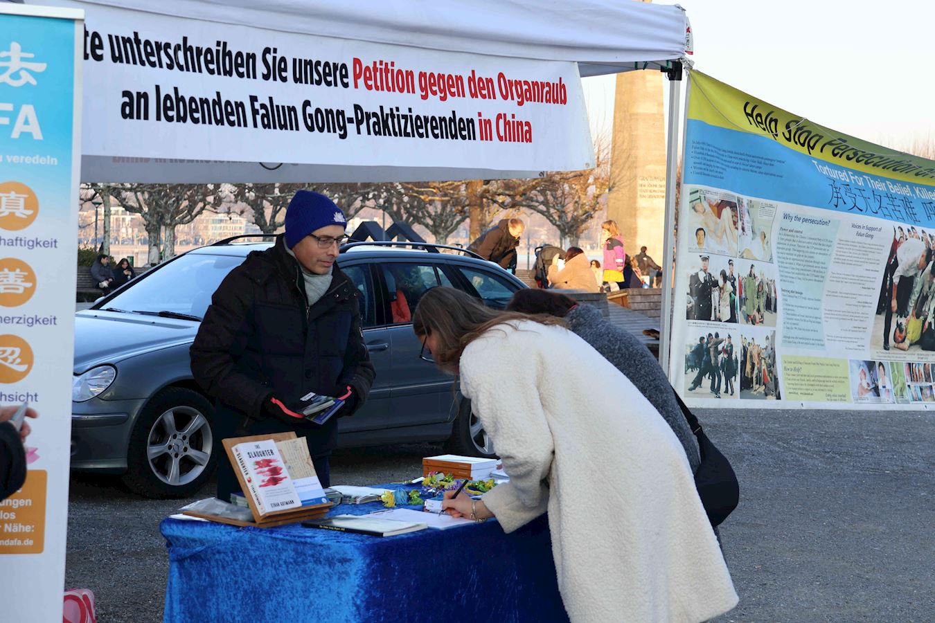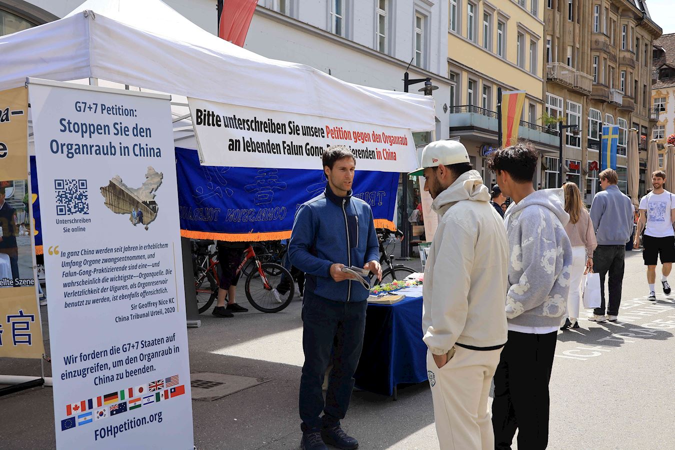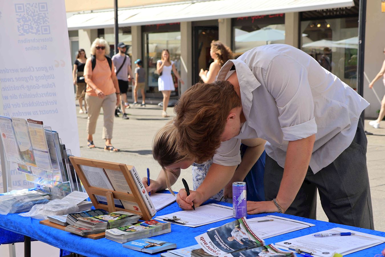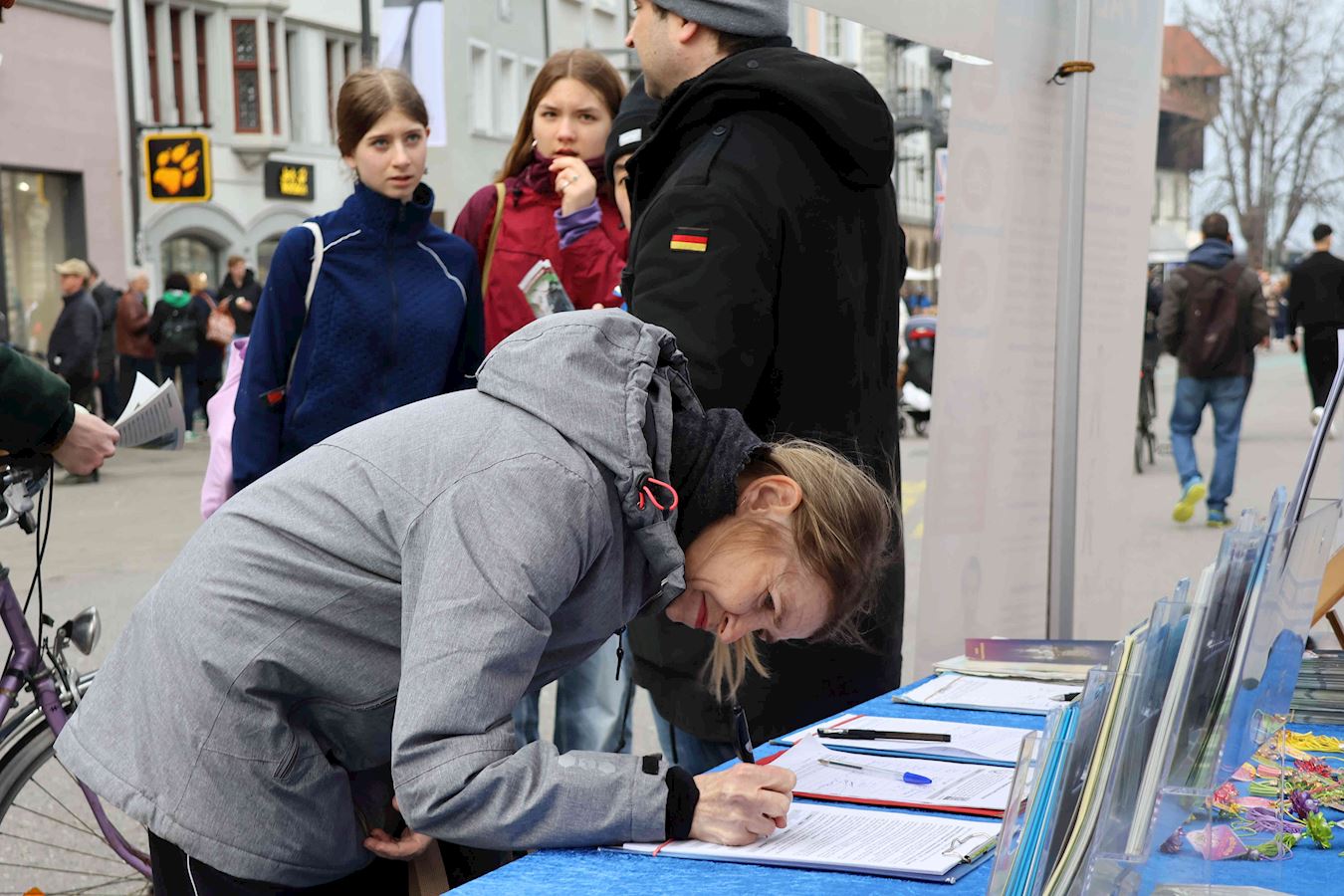 于是,在过去的半年里,明白了真相的路人在康斯坦茨渡船码头及市中心马克特广场(Marktstätte)签署了多份请愿书要求多国政府采取行动制止中共迫害法轮功及活摘器官的罪行。其中两份分别递交德国联邦政府及瑞士联邦委员会,还有一份将提交给G7+7共十四个国家。(G7为:加拿大、法国、德国、意大利、日本、英国及美国,+7为:阿根廷、澳大利亚、印度、以色列、墨西哥、韩国及台湾。)