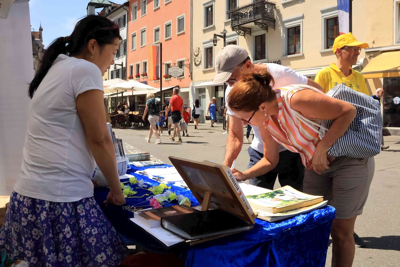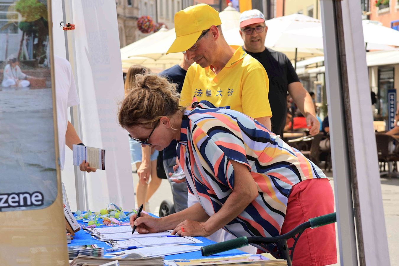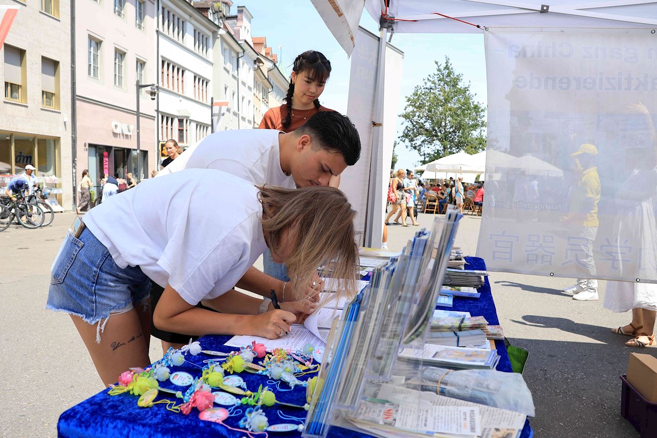 于是,在过去的半年里,明白了真相的路人在康斯坦茨渡船码头及市中心马克特广场(Marktstätte)签署了多份请愿书要求多国政府采取行动制止中共迫害法轮功及活摘器官的罪行。其中两份分别递交德国联邦政府及瑞士联邦委员会,还有一份将提交给G7+7共十四个国家。(G7为:加拿大、法国、德国、意大利、日本、英国及美国,+7为:阿根廷、澳大利亚、印度、以色列、墨西哥、韩国及台湾。)