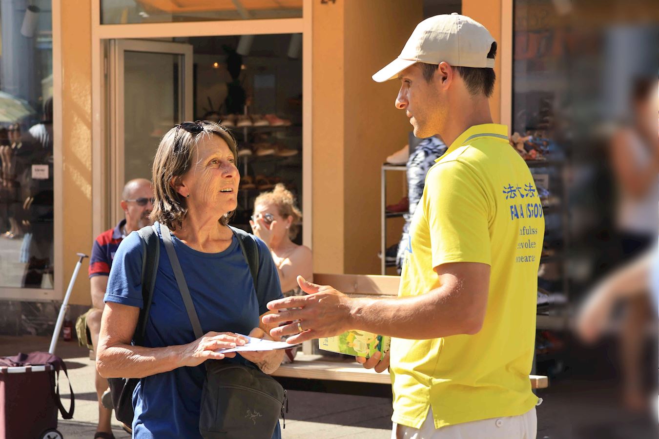 每次活动当天的早上詹卢卡(Gianluca)都会和同修法轮大法的妻儿一起将帐篷及各种资料塞满他们的小车,驱车近一个小时来到康斯坦茨。其他法轮功学员会从附近城市及瑞士赶来,大家一起告诉路人法轮大法的真相。