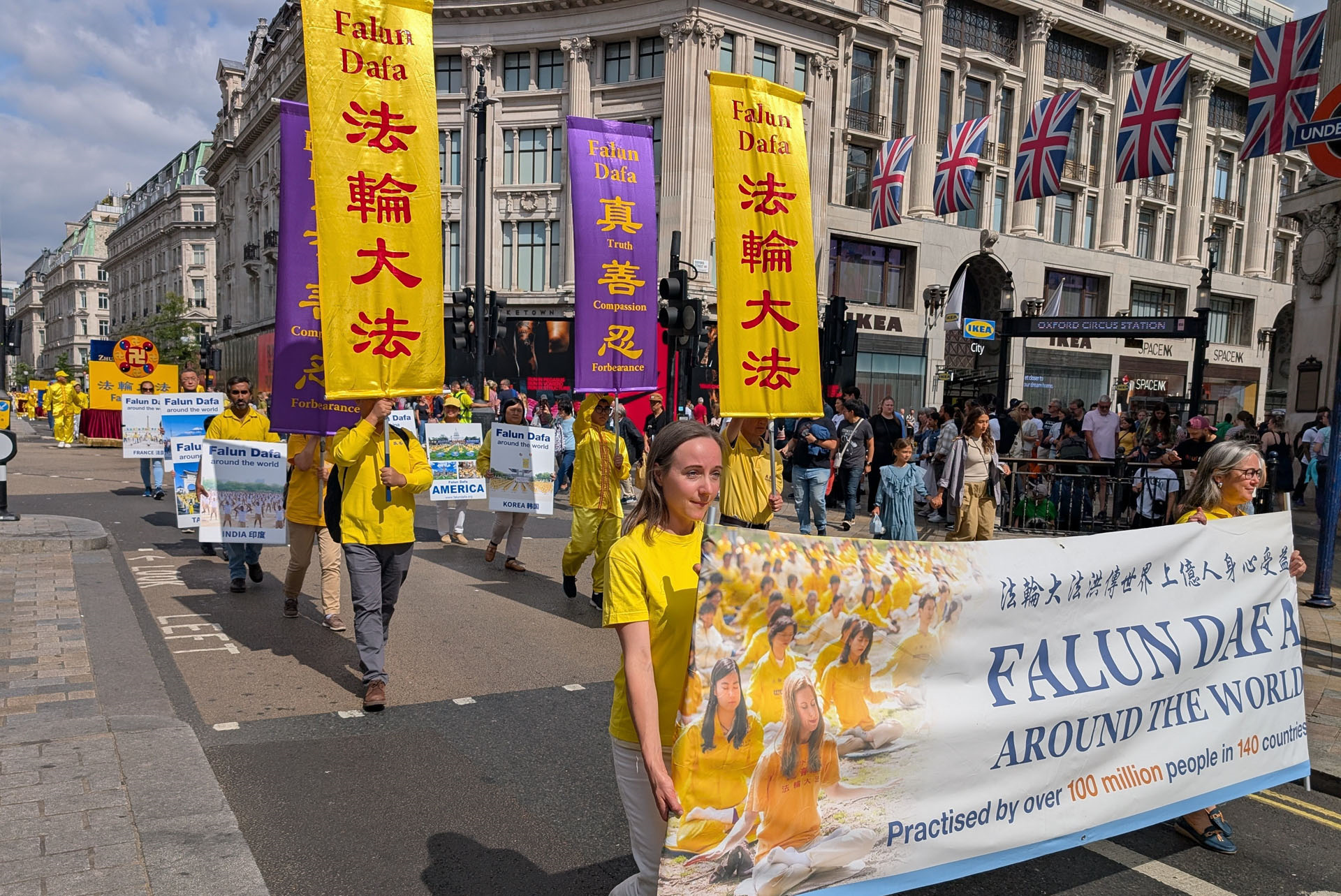 游行队伍中午十二点自中共大使馆对面启程,伴随着宁静悠扬的炼功音乐和铿锵有力的腰鼓声,穿过这座国际都会的心脏地带,途经摄政街、牛津广场、皮卡迪利广场和唐人街,并于下午一点半左右抵达特拉法加广场。