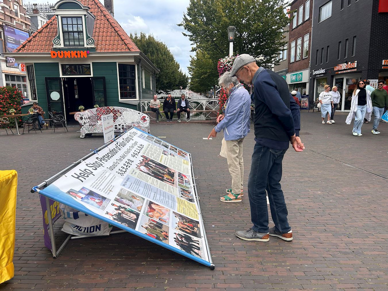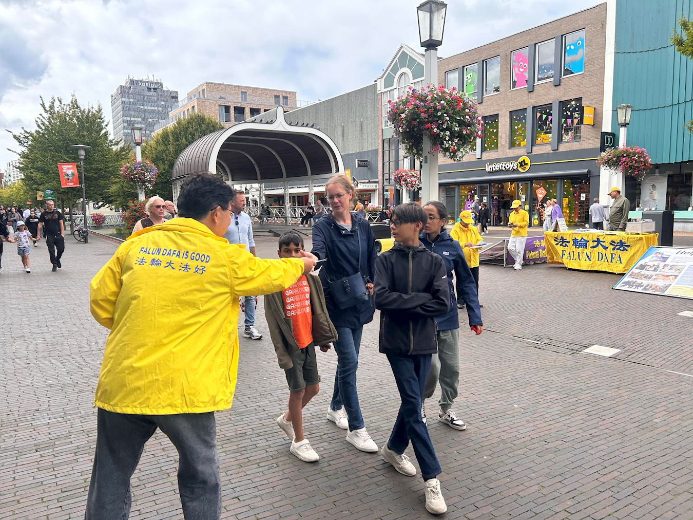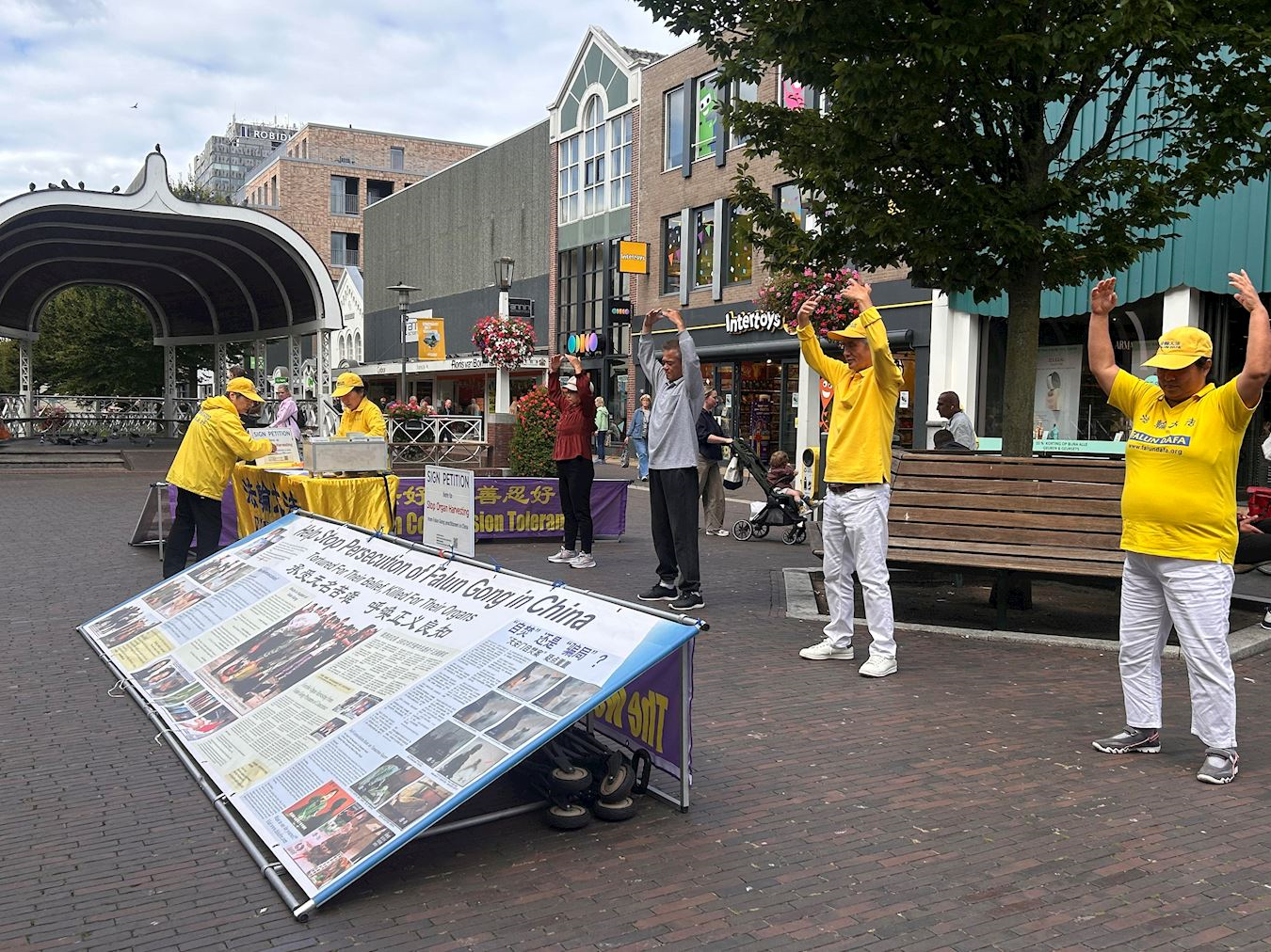 星期六的午后,阳光明媚,学员们在赞丹市的格登普特·格拉赫特(Gedempte Gracht)商业中心展示法轮功功法,布置真相展板,分发传单并征集签名反对中共迫害,吸引了很多游客驻足。