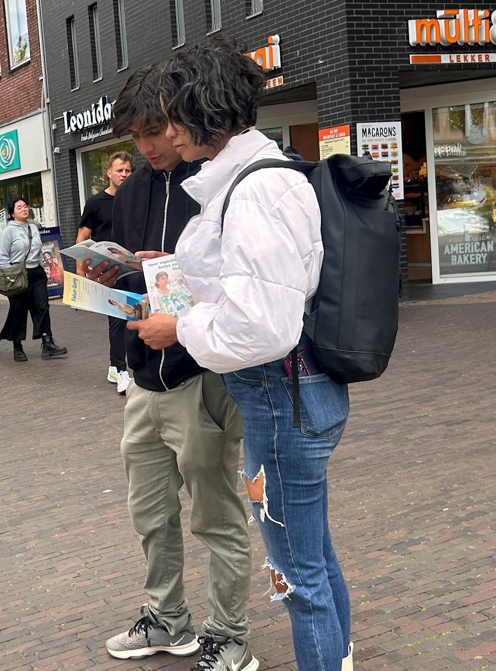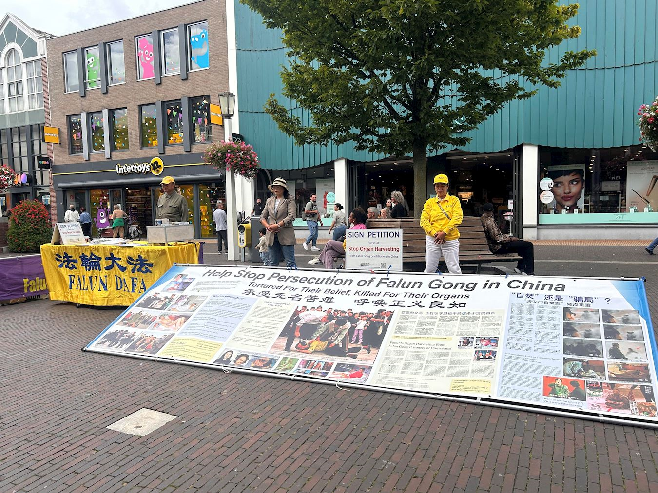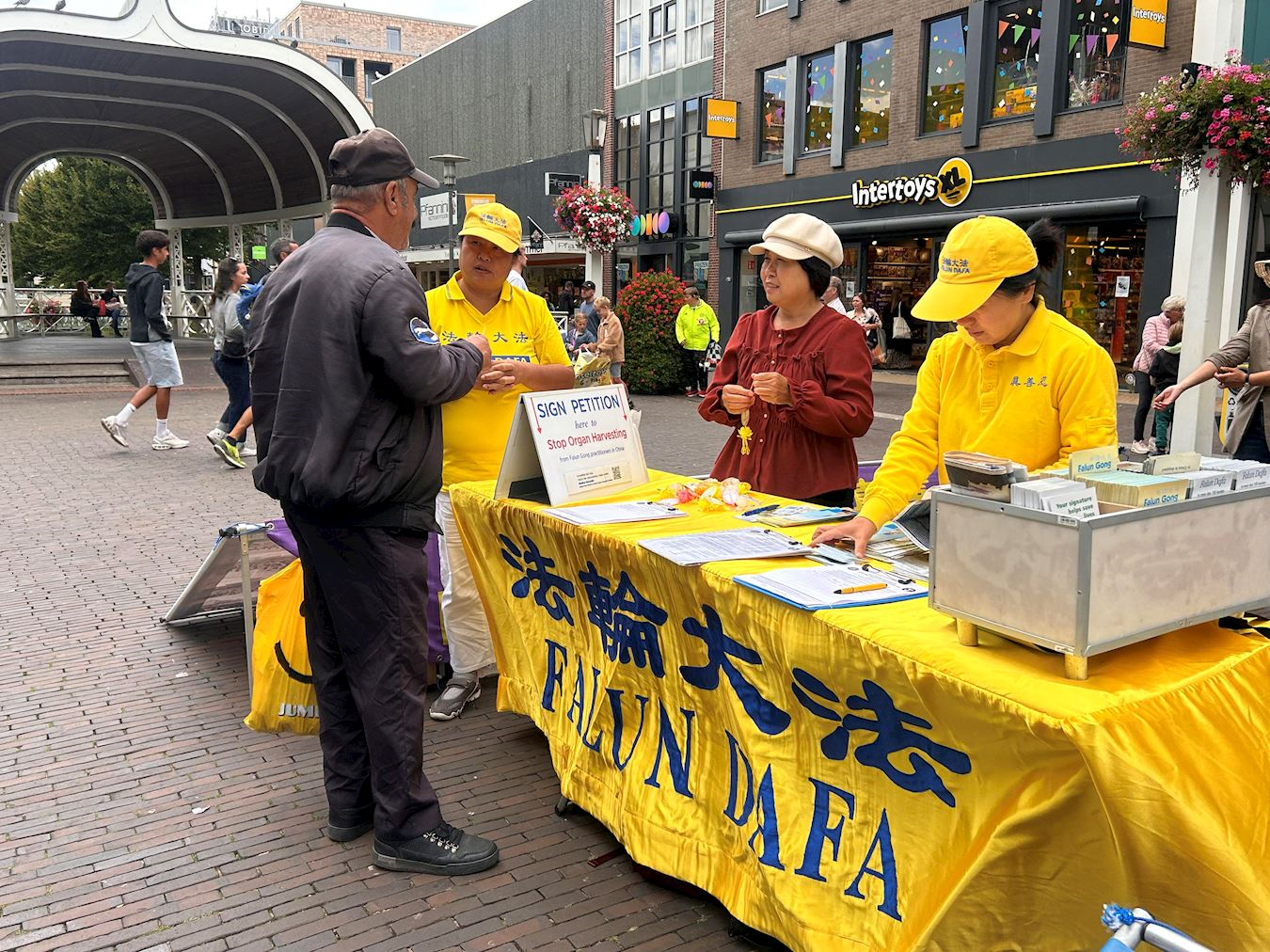 星期六的午后,阳光明媚,学员们在赞丹市的格登普特·格拉赫特(Gedempte Gracht)商业中心展示法轮功功法,布置真相展板,分发传单并征集签名反对中共迫害,吸引了很多游客驻足。