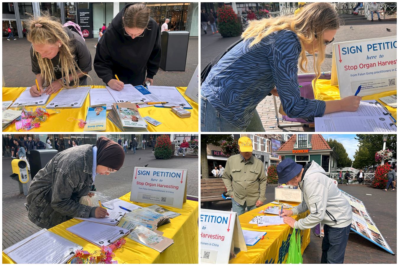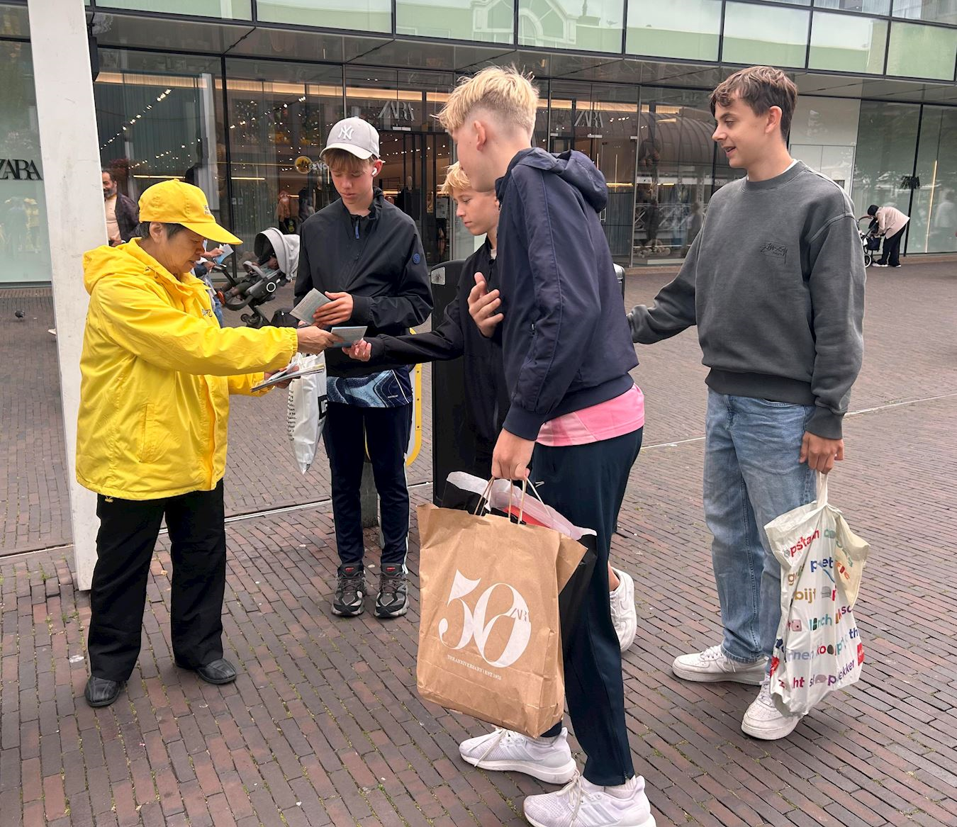 一对荷兰母女读过学员赠送的真相传单后返回征签桌前,郑重地写下自己的名字,母亲告诉学员:“这些事情太令人难过了,我为你们的遭遇流泪了,这些(迫害事实)现在还发生吗?”