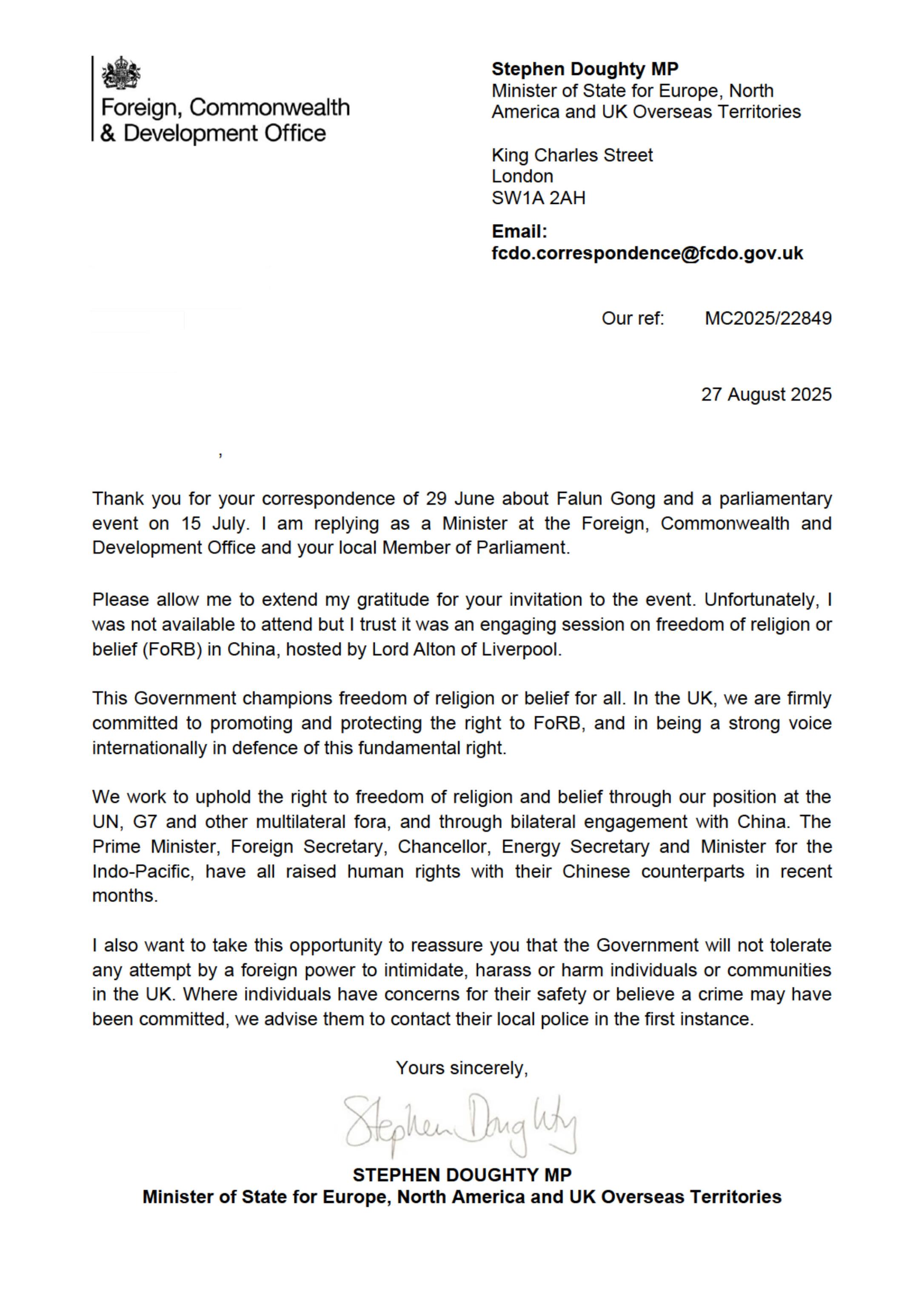 ![]() 图1~2:外交部欧洲事务部长斯蒂芬·道蒂(Stephen Doughty)议员和他的信件原件 |