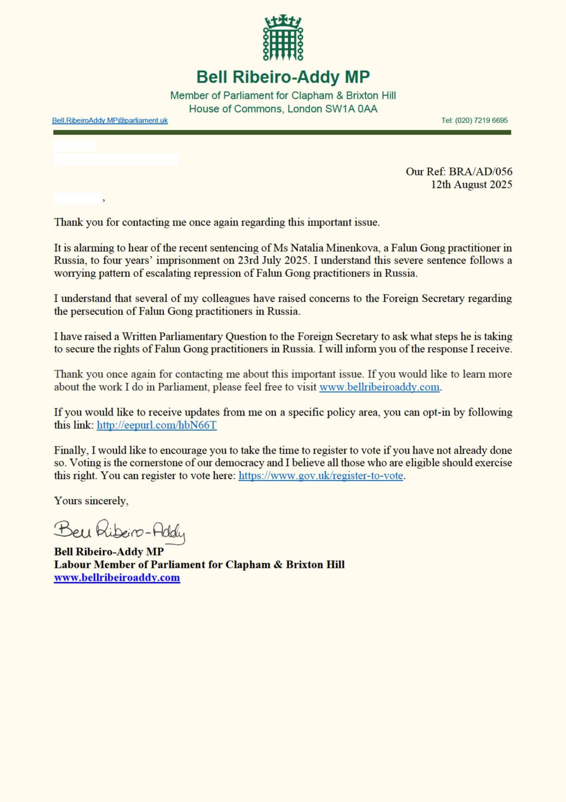 国会议员贝尔·里贝罗-阿迪(Bell Ribeiro-Addy)指出:“听到俄罗斯法轮功学员娜塔莉娅·米宁科娃于二零二五年七月二十三日被判处四年监禁的消息,令人十分震惊。我了解到,这一严厉判决反映出俄罗斯对法轮功学员日益加剧的打压力度。”