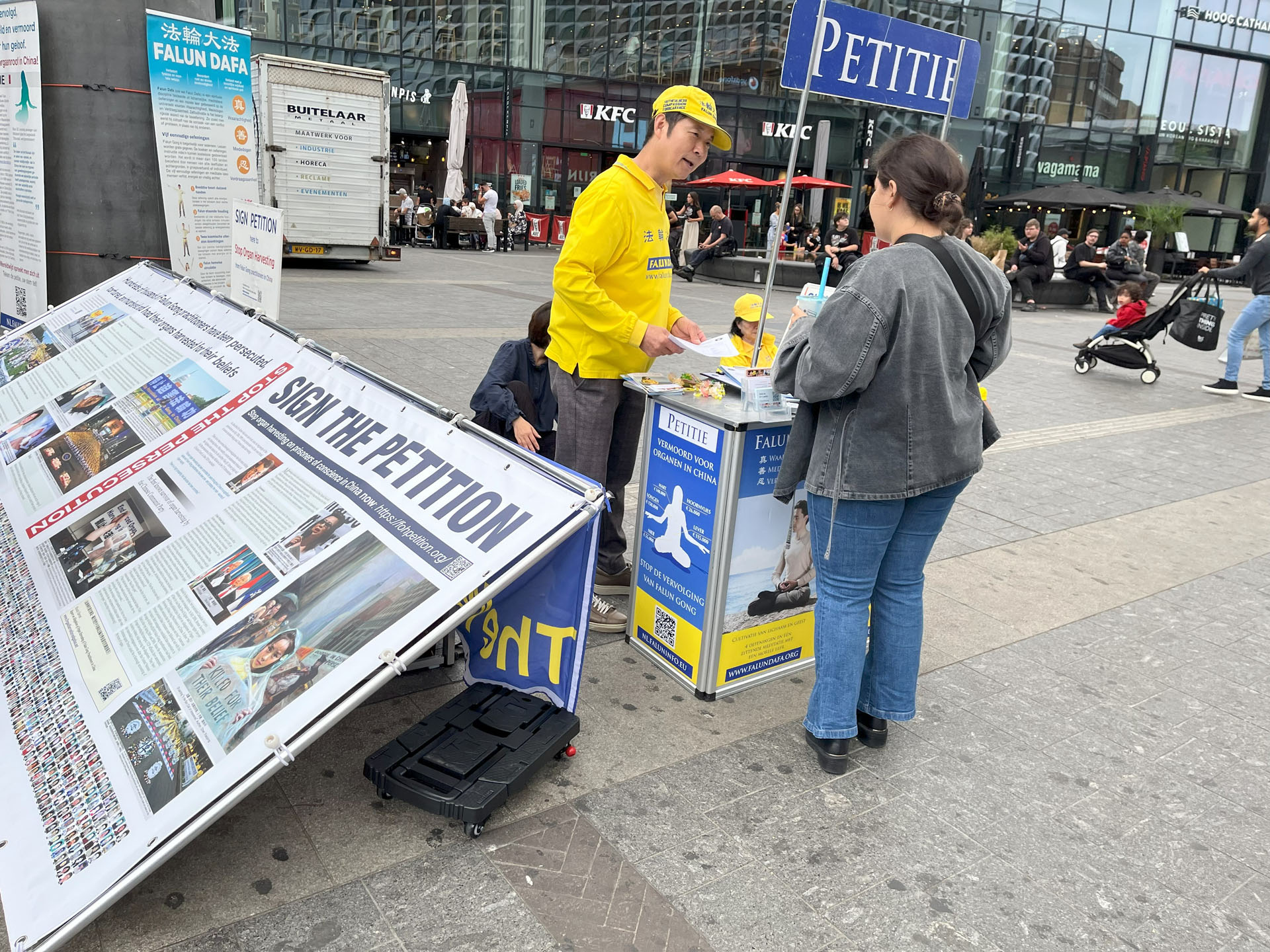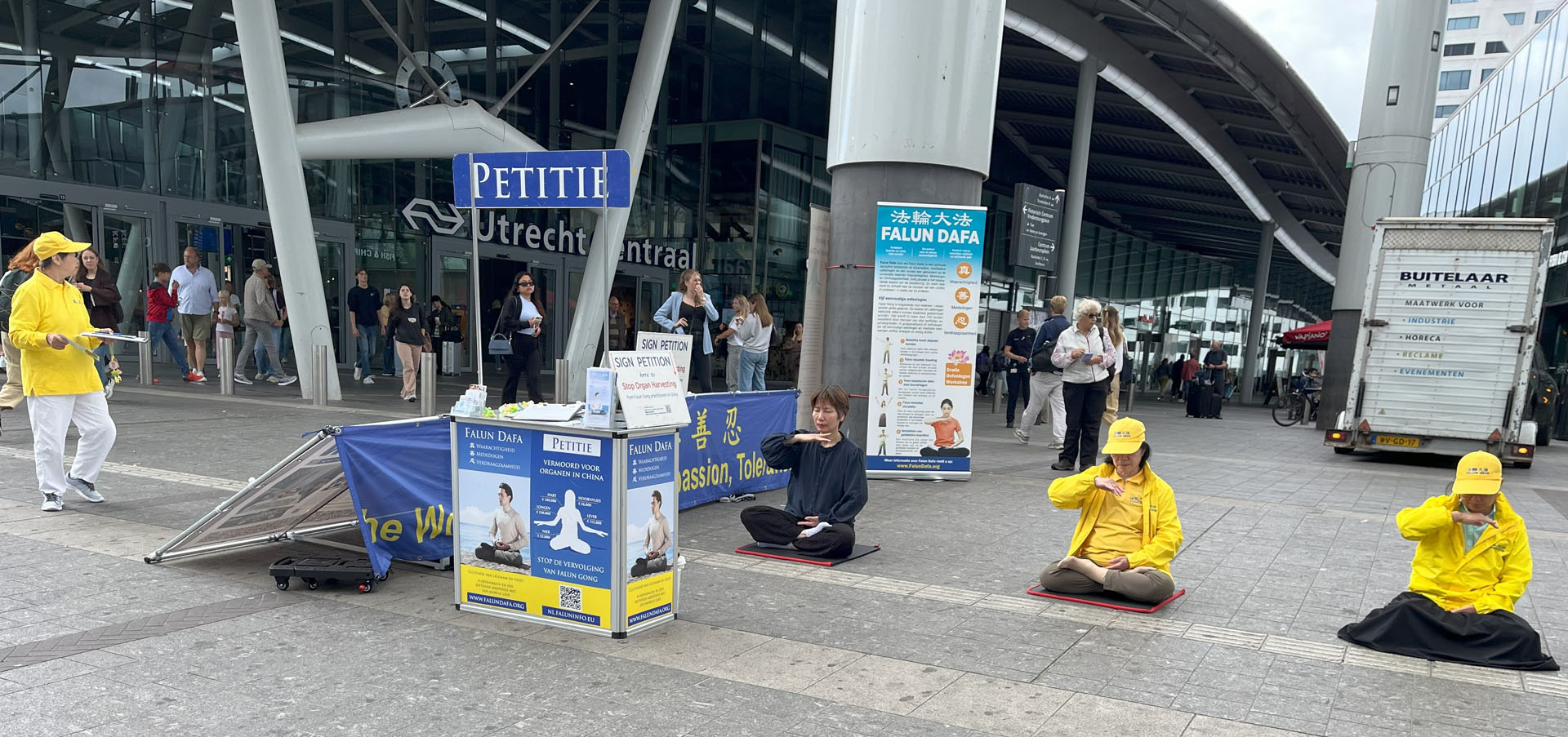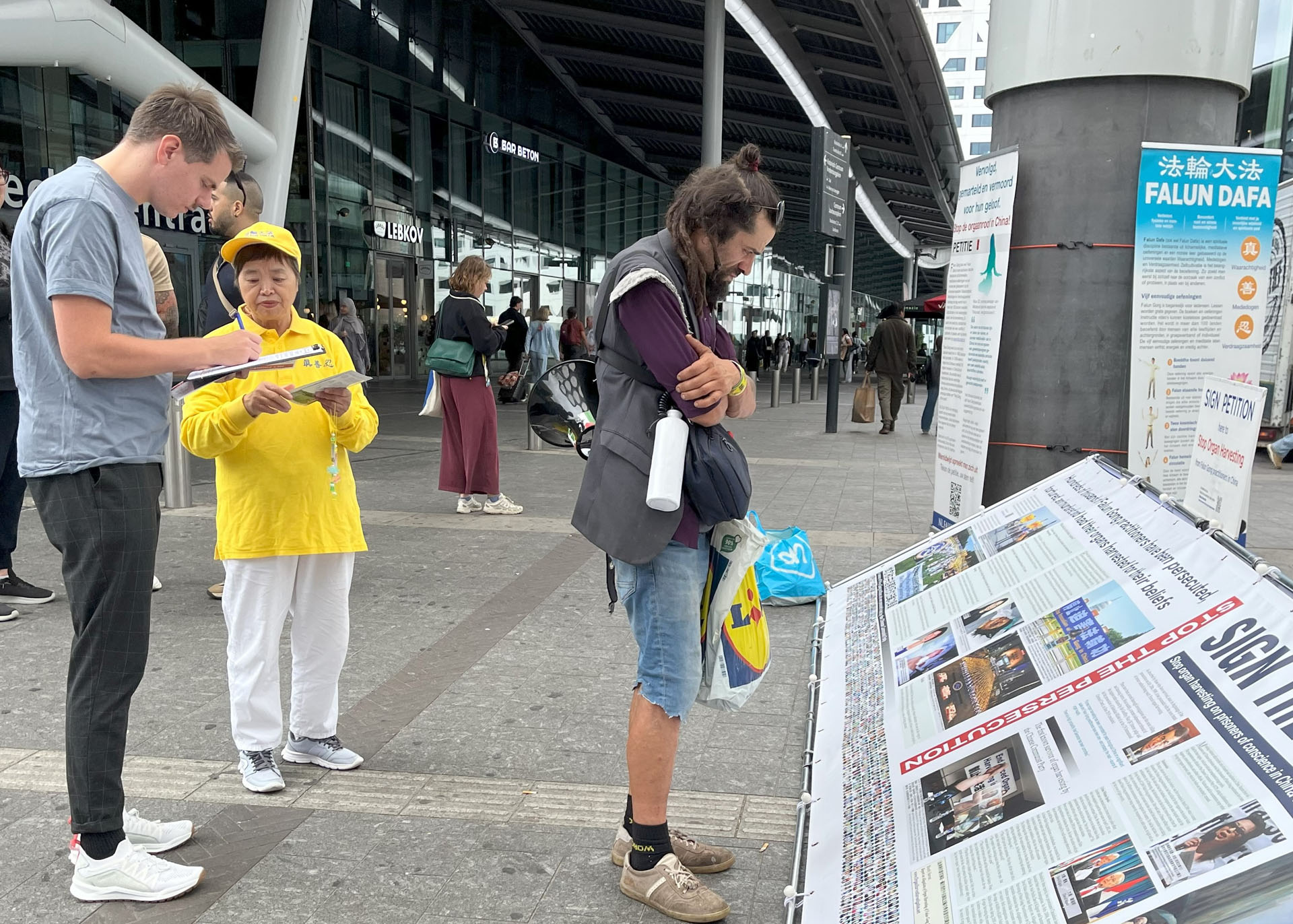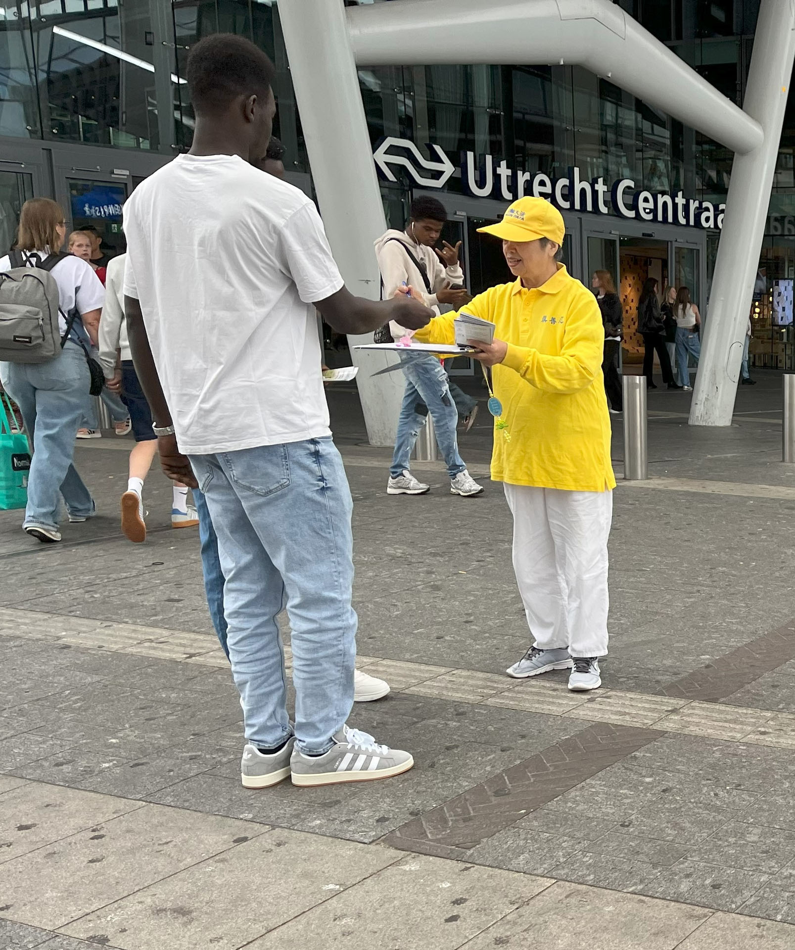 乌得勒支是荷兰第四大城市,是乌得勒支省的省会。活动当天,学员们在中央火车站出口处设置展位,悠扬的音乐声和真相横幅吸引了许多路人的注意,他们仔细阅读真相资料,并踊跃在向G7+7国家提交的请愿书上签名(注:G7国家为美国、加拿大、法国、德国、意大利、日本、英国,+7国家为阿根廷、澳大利亚、印度、以色列、墨西哥、韩国及台湾)。他们中的很多人不但感谢学员们为大家提供了这些宝贵的信息,还表示法轮大法的价值观非常重要,每个人都应该以真、善、忍的方式对待彼此。