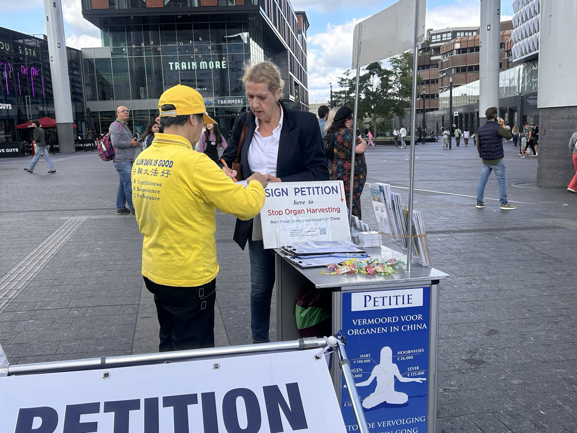 乔·尼姆维根(Jo Nimwegen)女士也来自乌得勒支,在荷兰曾经获得他人捐献的器官,当得知中共强行摘取法轮大法修炼者的器官并杀害他们的消息后,她指着请愿板说,这就是自己签名的原因。