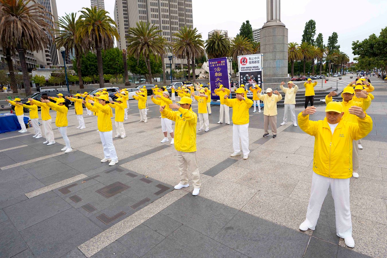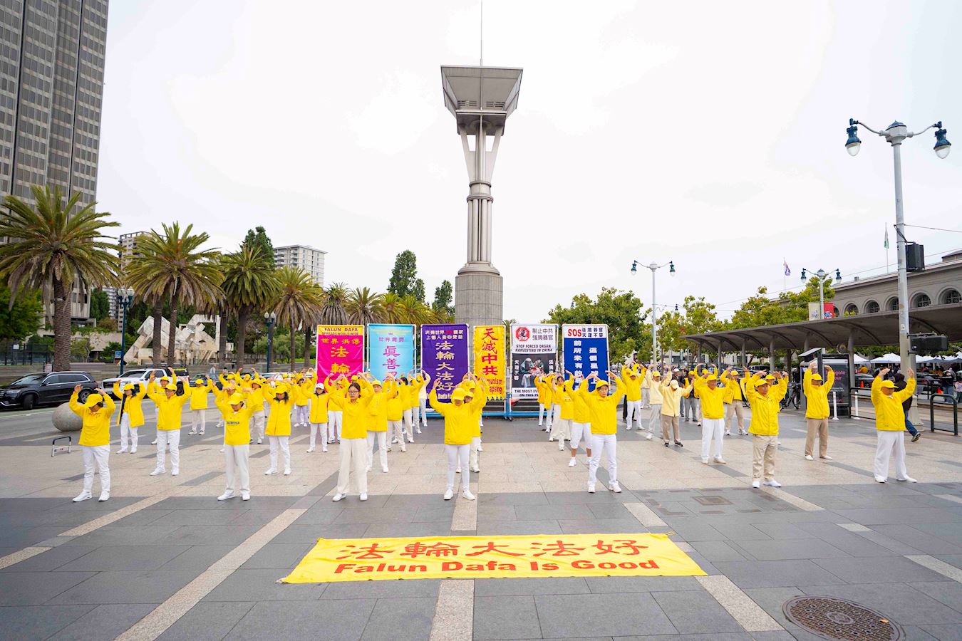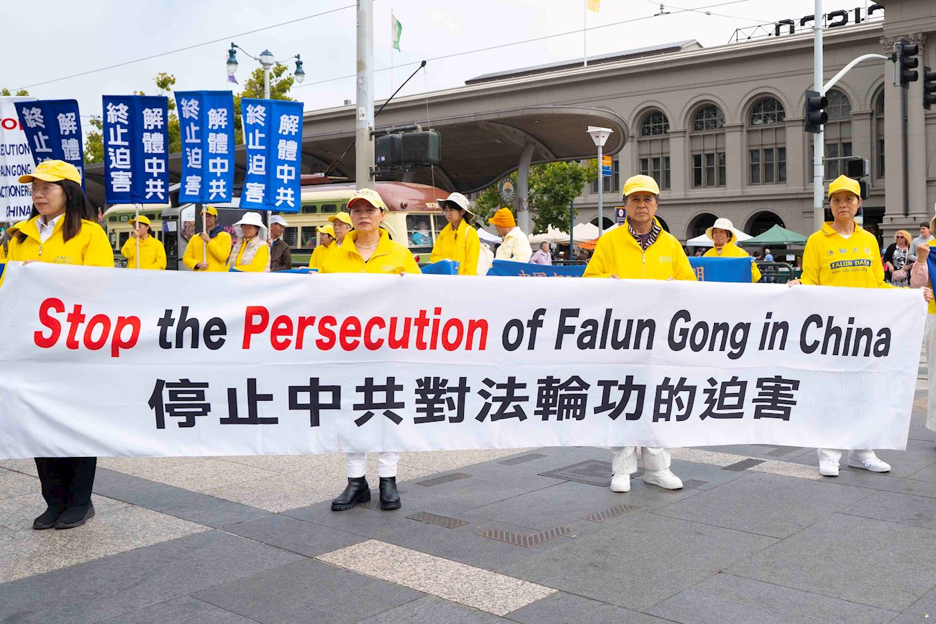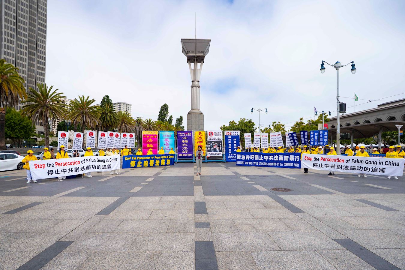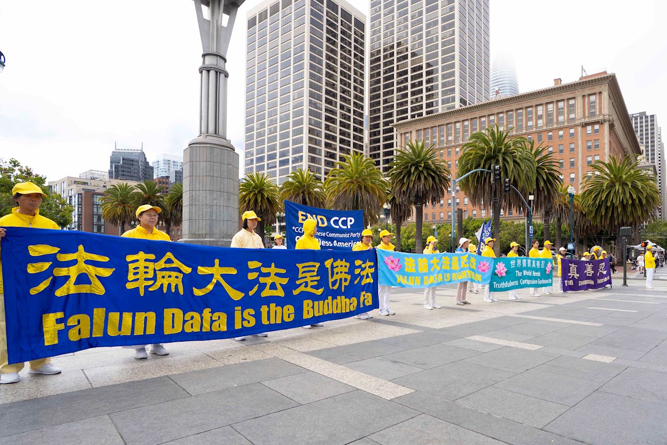 旧金山街头艺术家李科女士听说法轮功学员当天有集会,特地赶来声援。她拿着写有“旧金山民众支持法轮功”的展版说:“为了表达我的诚意,我就画了一个图,做个牌子支持你们。”