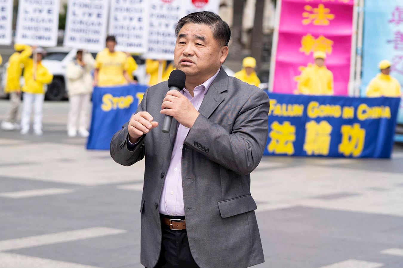 集会上,来自黑龙江省的法轮功学员王先生讲述了他和妻子在中国大陆被迫害的情况。