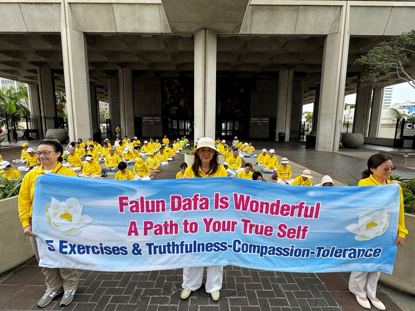 在车水马龙的街道旁,伴随着悠扬的音乐,法轮功学员静静地打坐、炼功的祥和场景,与这座繁忙的城市形成鲜明对比。活动吸引了附近政府工作人员和过往路人驻足观看、前来了解真相。