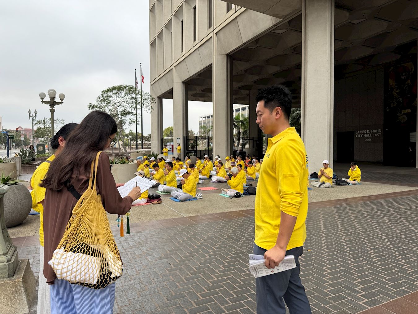 洛杉矶居民帕特里莎(Patrisha)接过传单后仔细阅读,并静静观看法轮功学员炼功。她说:“他们真的好善良,看着他们我都感到很平和,我也想要跟他们一起炼。而且世界都需要‘真、善、忍’这一价值观。”