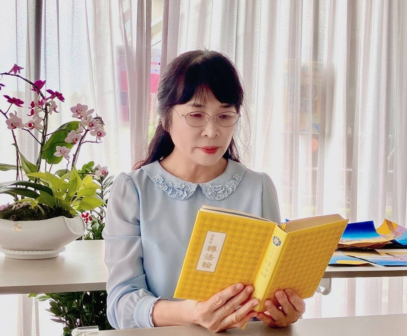 ![]() 图1:从事三十年小学教育的林月蕊在阅读法轮大法著作《转法轮》 |