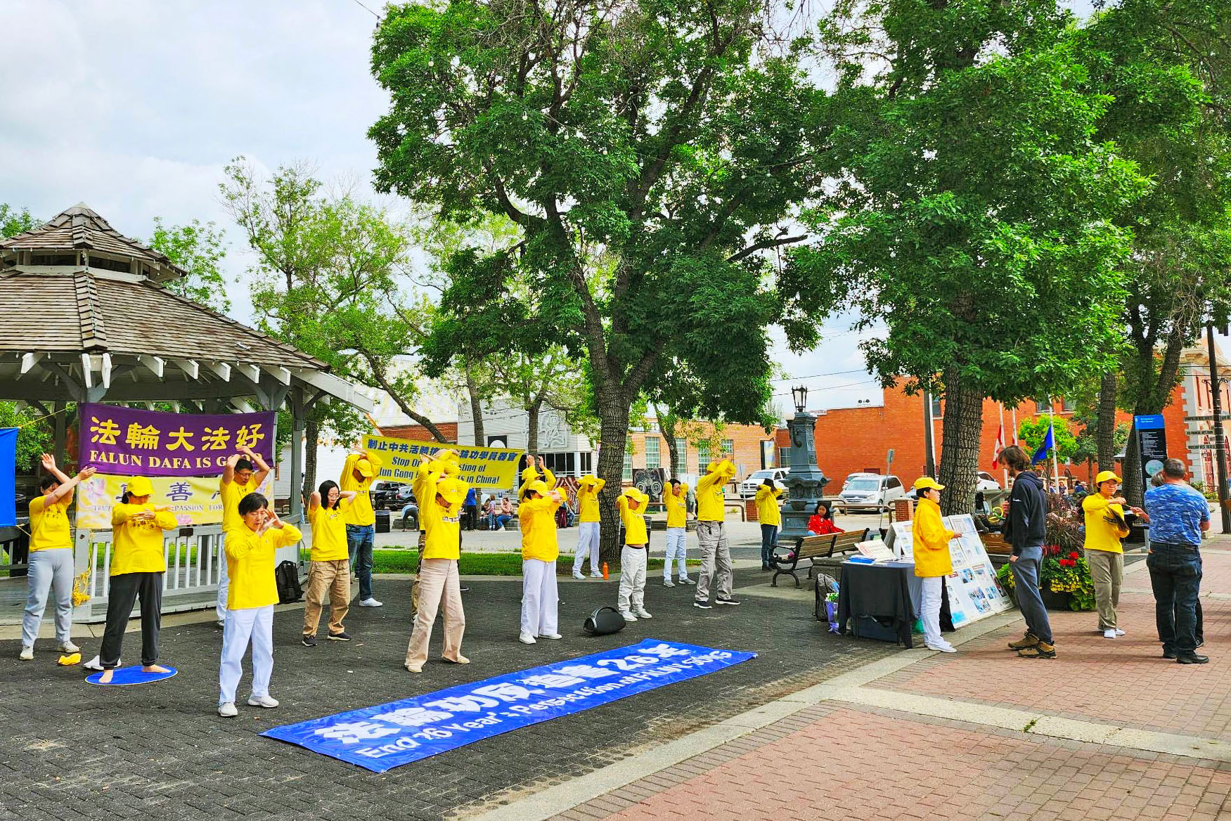 ![]() 图1~2:二零二五年七月二十六日,加拿大埃布尔塔省府埃德蒙顿的部分法轮功学员在老斯特拉斯科纳农贸市场集会上功法演示。 |