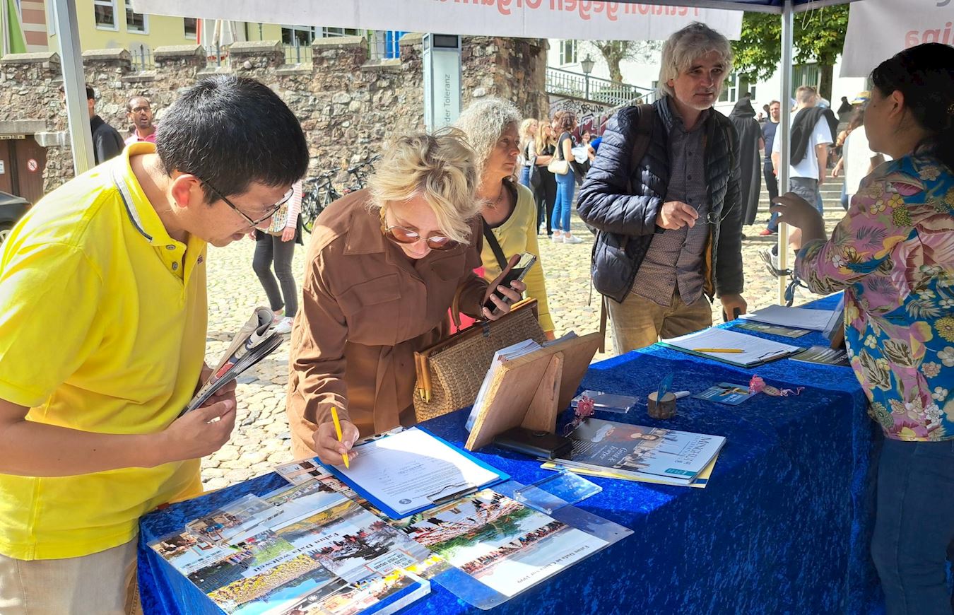 一位亚裔面孔的年轻人径直走到法轮功信息台前,翻看台案上的各种真相资料。听说有中文的,他喜出望外,伸手全都接过去了。听得出他是大陆口音,果然是来德国读博的大陆留学生,搞数字模拟专业的。