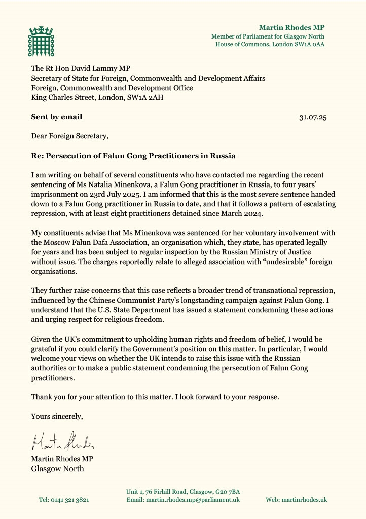 英国国会议员马丁·罗兹(Martin Rhodes)在七月三十一日给英国外交大臣戴维·拉米的邮件中说:“我代表多位与我联系的选民写信给您,他们向我反映了近期俄罗斯法轮功学员娜塔莉娅·米年科娃女士于二零二五年七月二十三日被判处四年监禁一事。据我所知,这是迄今在俄罗斯对法轮功学员作出的最严厉判决。这一事件延续了不断升级的打压趋势,自二零二四年三月以来,至少已有八名学员被拘押。”