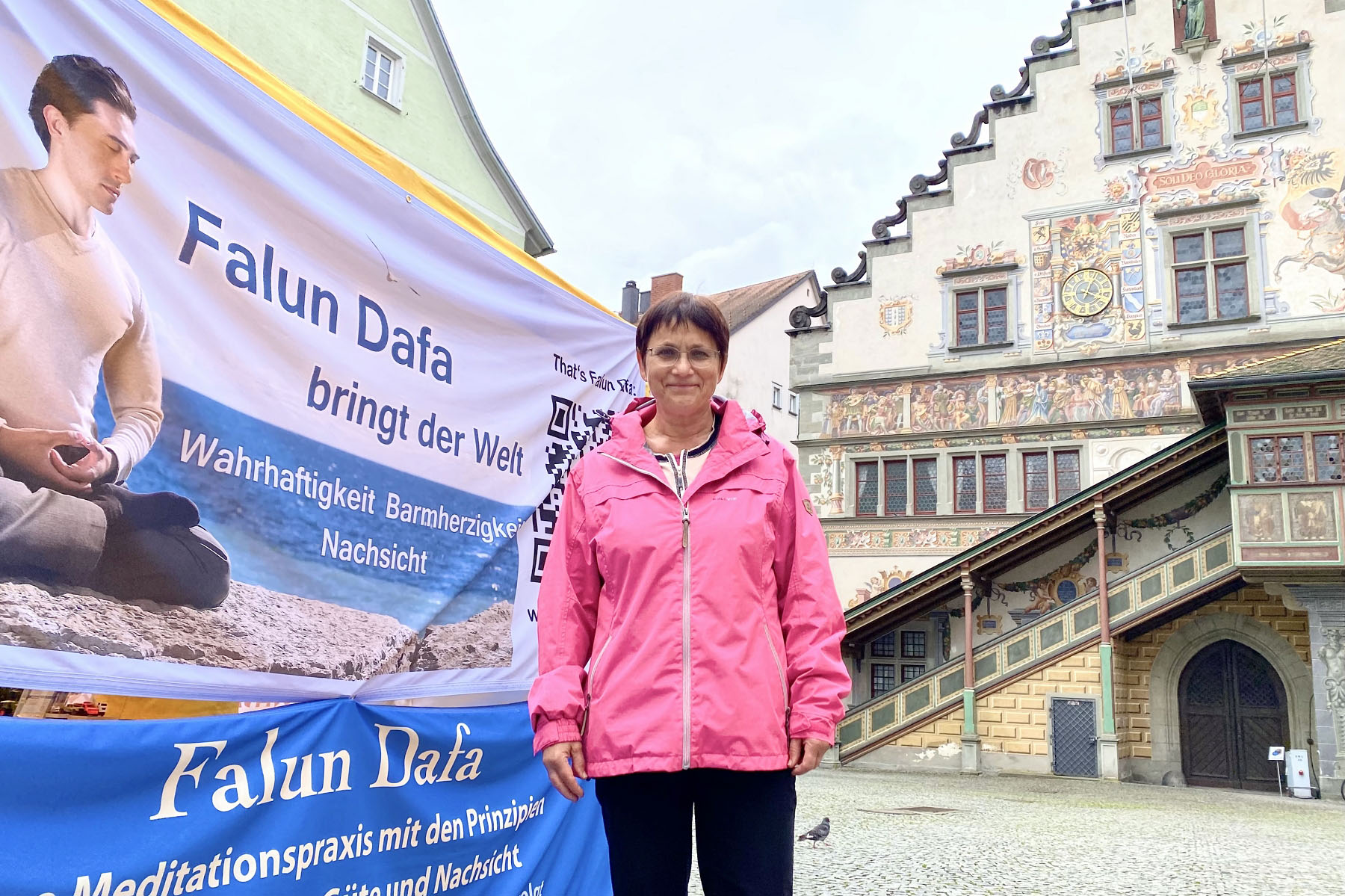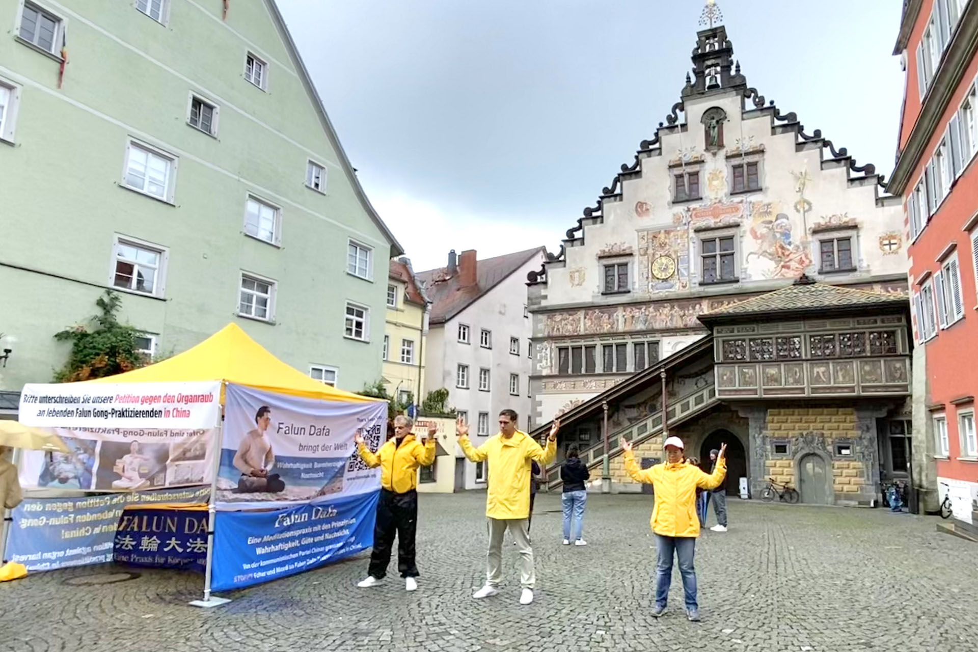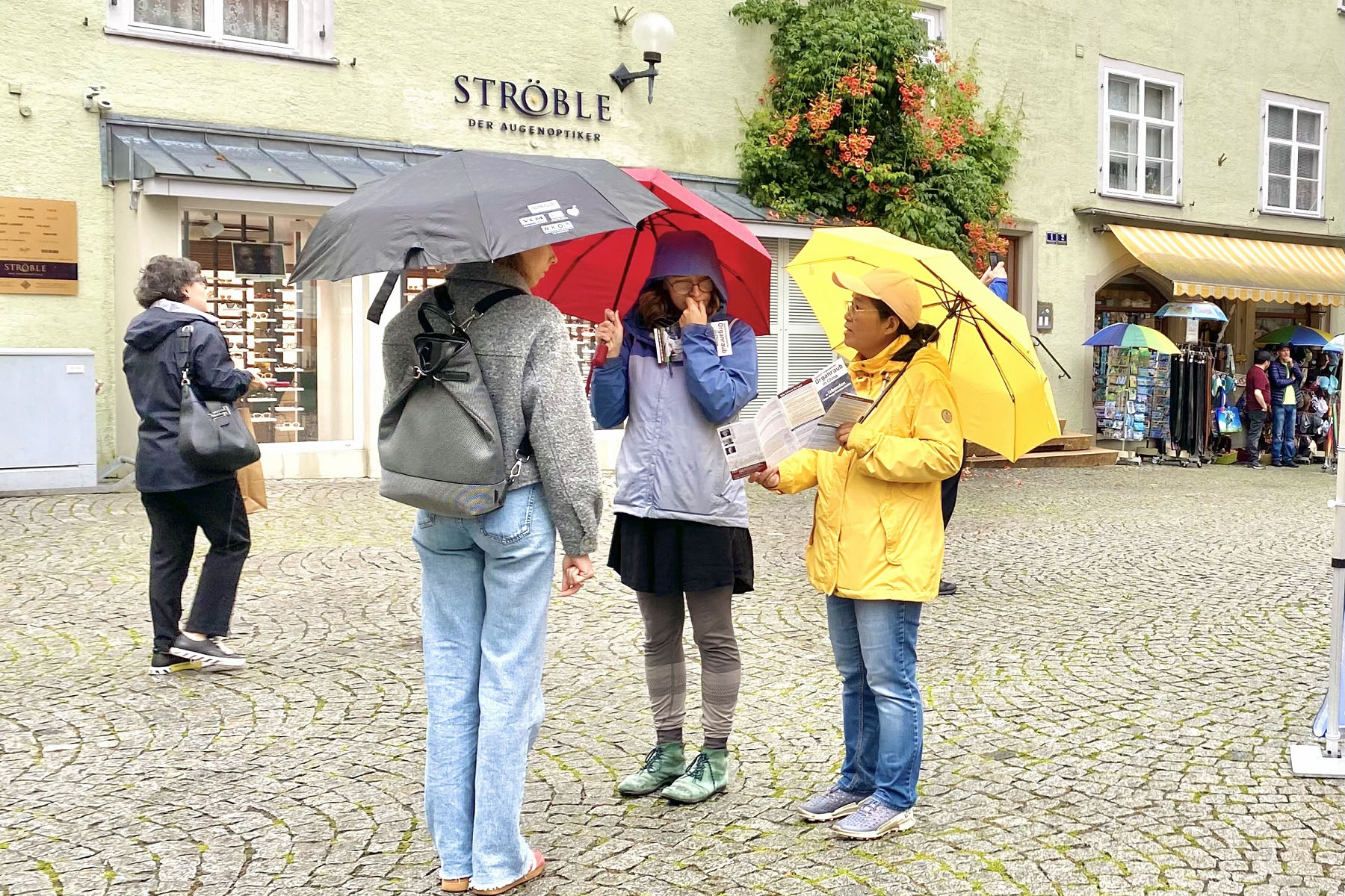 ![]() 图2~4:二零二五年八月二日,法轮功学员在德国林岛(Lindau)市政厅前俾斯麦广场(Bismarck Platz)冒雨举办活动。 |