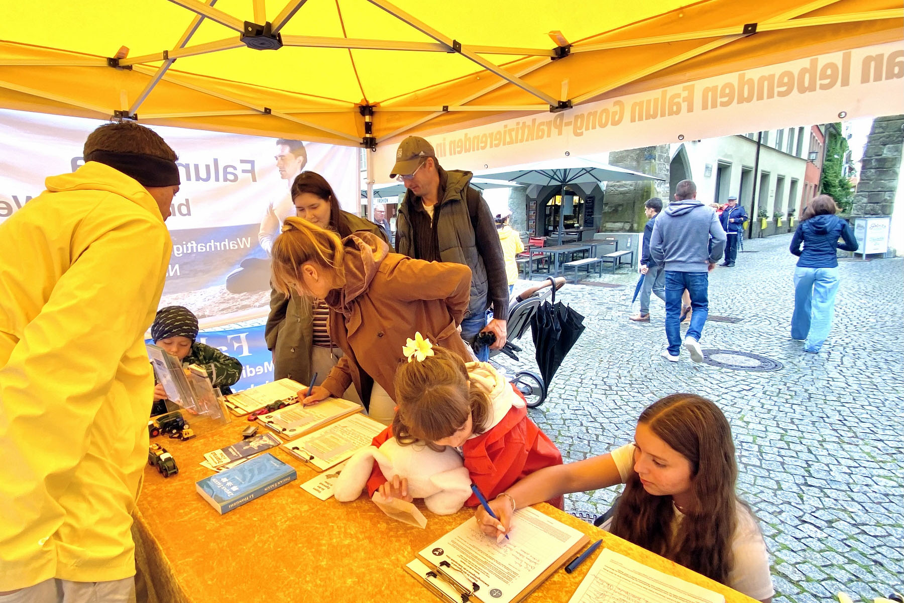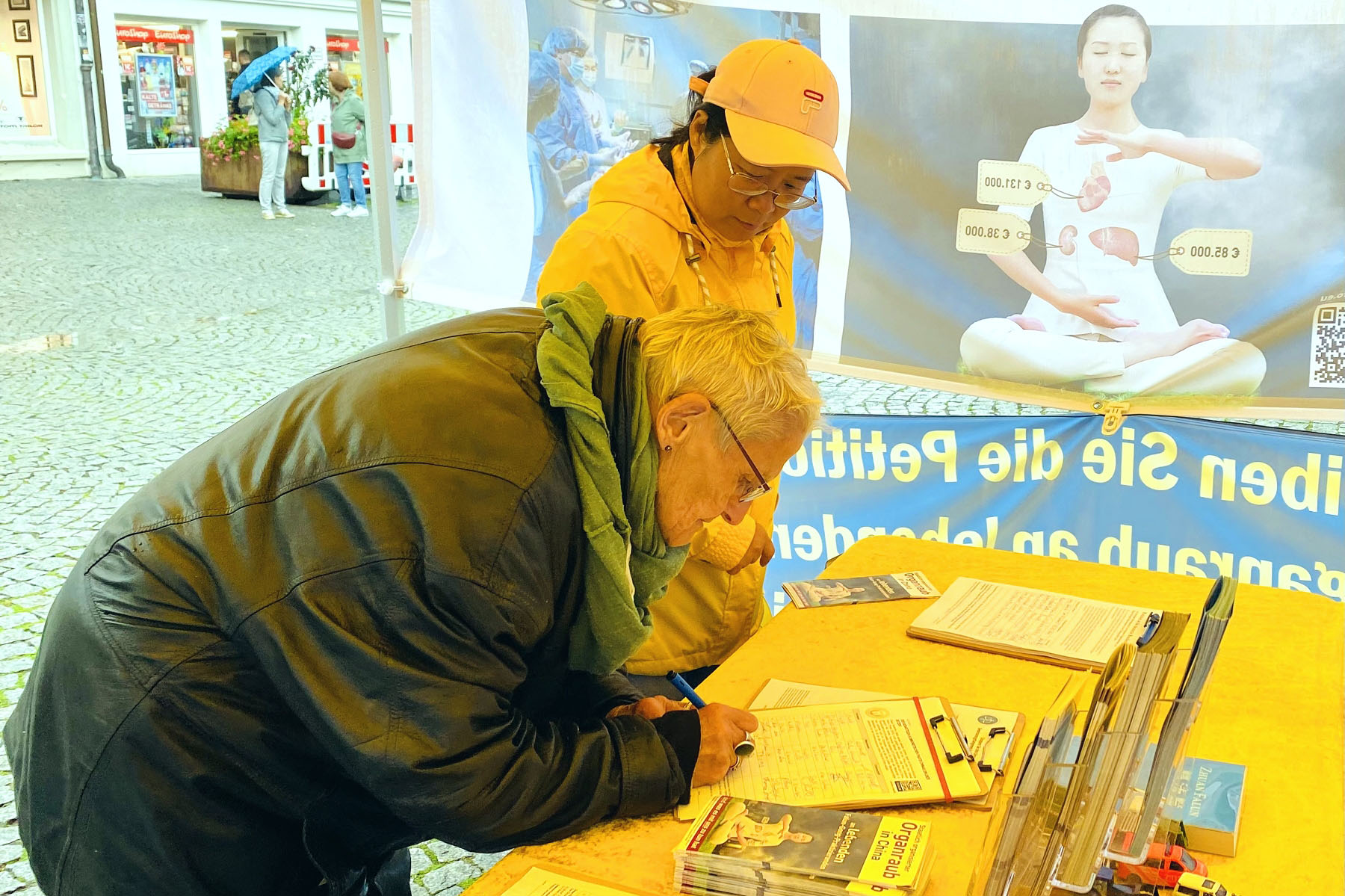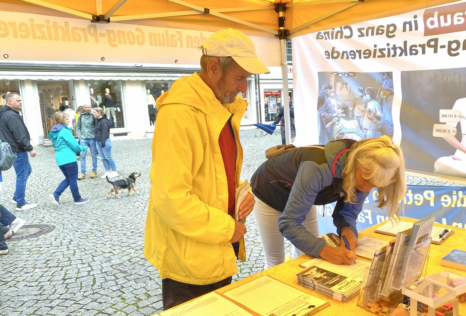 一对德国夫妇斯特凡(Stefan)与布里塔(Britta)跟法轮功学员交谈之后,双双签名声援法轮功学员反迫害。