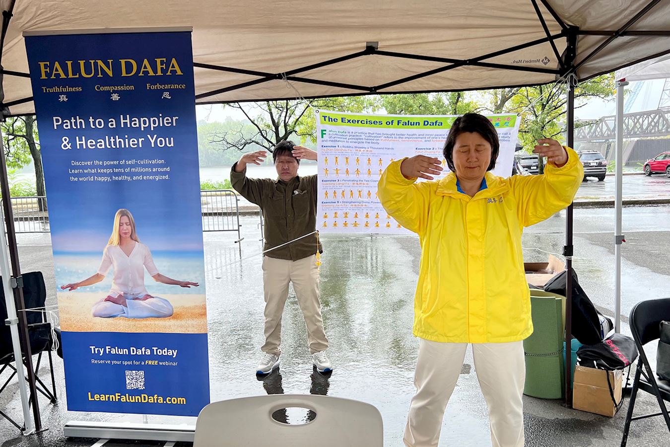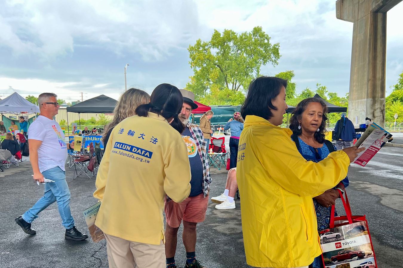 在音乐节上,当地的法轮功学员向民众展示祥和的炼功动作。伴随舒缓悠扬的炼功音乐,学员们在河畔静静炼功,吸引了不少观众驻足观看。两位女士走到展位前,细心聆听学员讲解功法。其中一位女士拿出手机录下炼功画面,并表示自己在脸书上拥有上千名粉丝。她说,她希望把炼功的宁静景象和法轮功在中国大陆遭受迫害的真实情况一并分享,让更多人能够看到和了解。