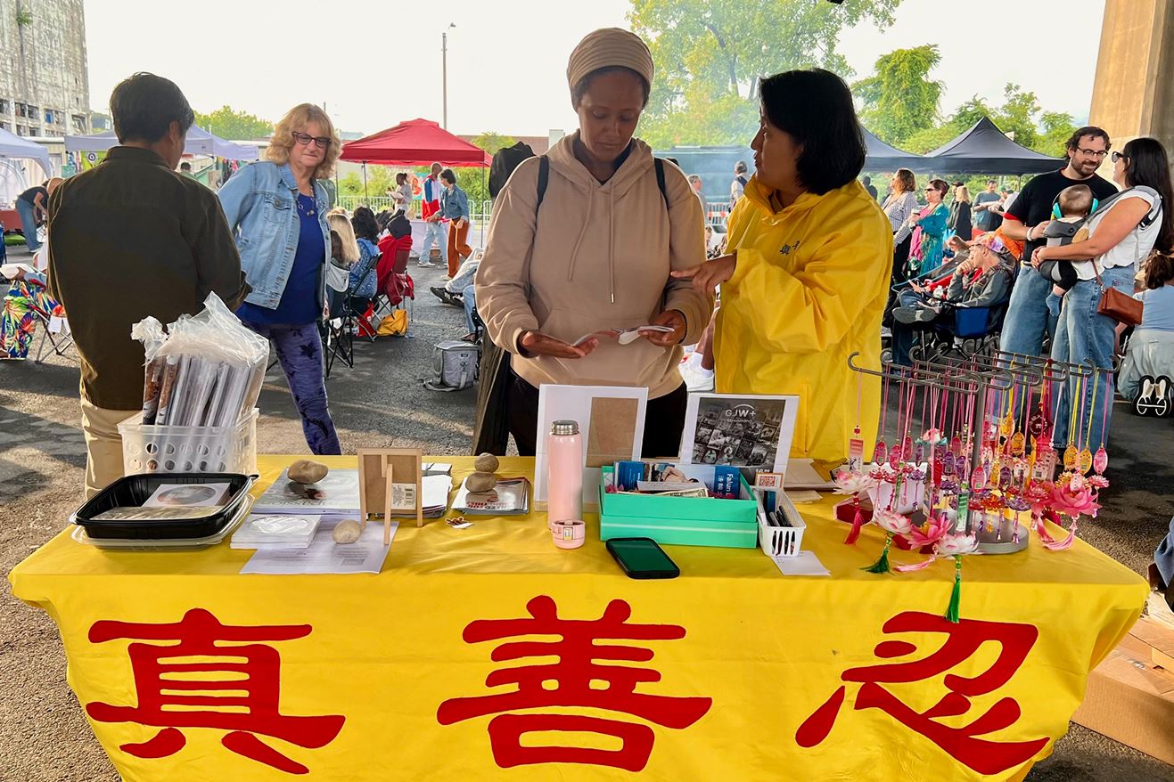 一位来自中国的女士来到法轮功的展位听完真相后表示,中共确实做了很多坏事,她愿意退出加入过的少先队。