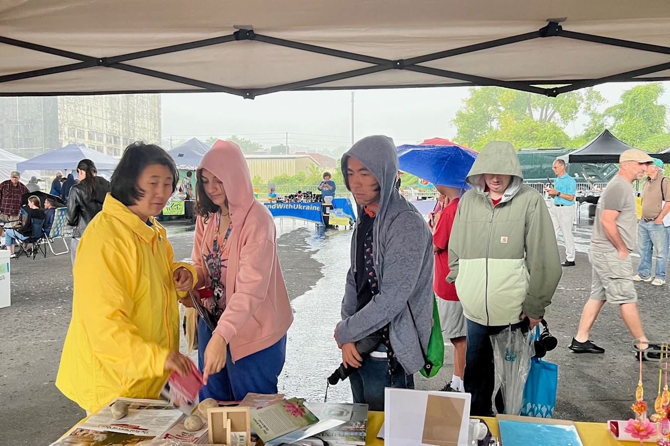 就在活动进行中,天空突然暗沉下来,暴雨倾泻而下。片刻之后,风雨渐渐平息,天空重新放晴,学员们恢复了功法演示,有人们冒雨来到法轮功展位前观看和了解如何学炼法轮功。