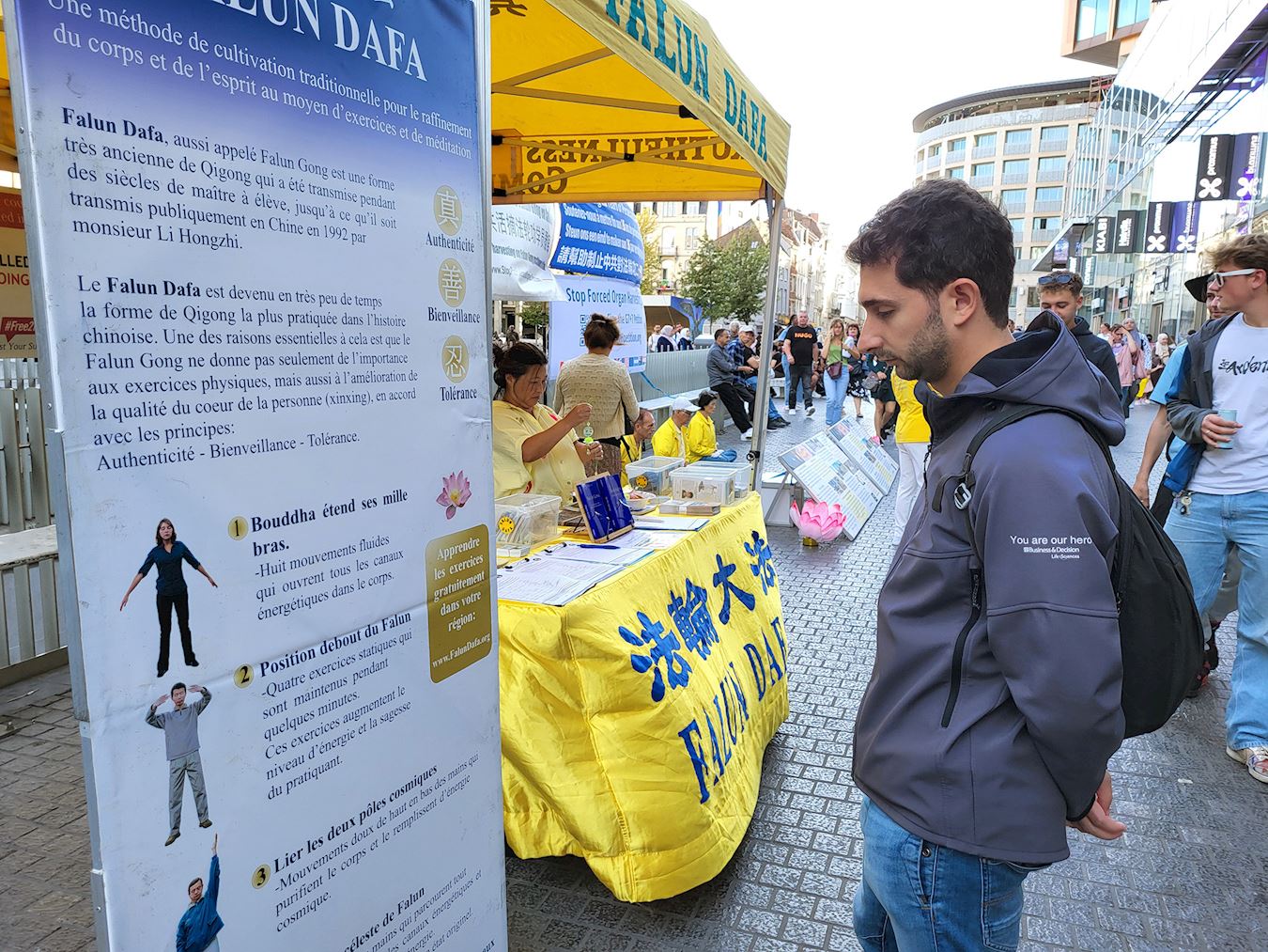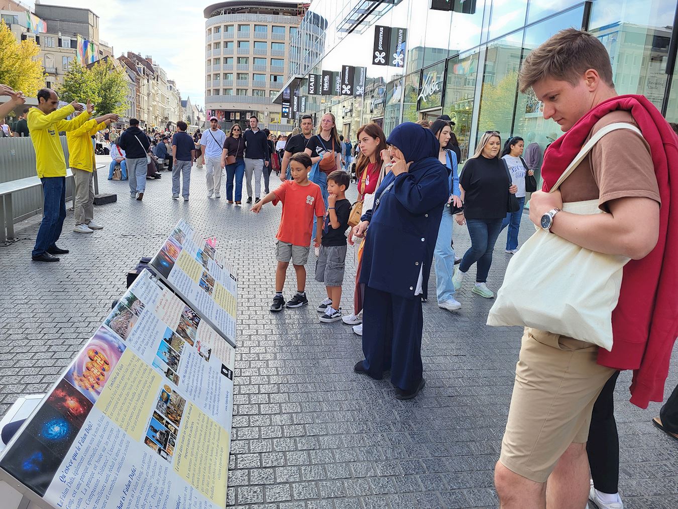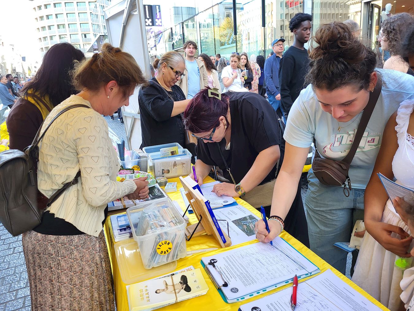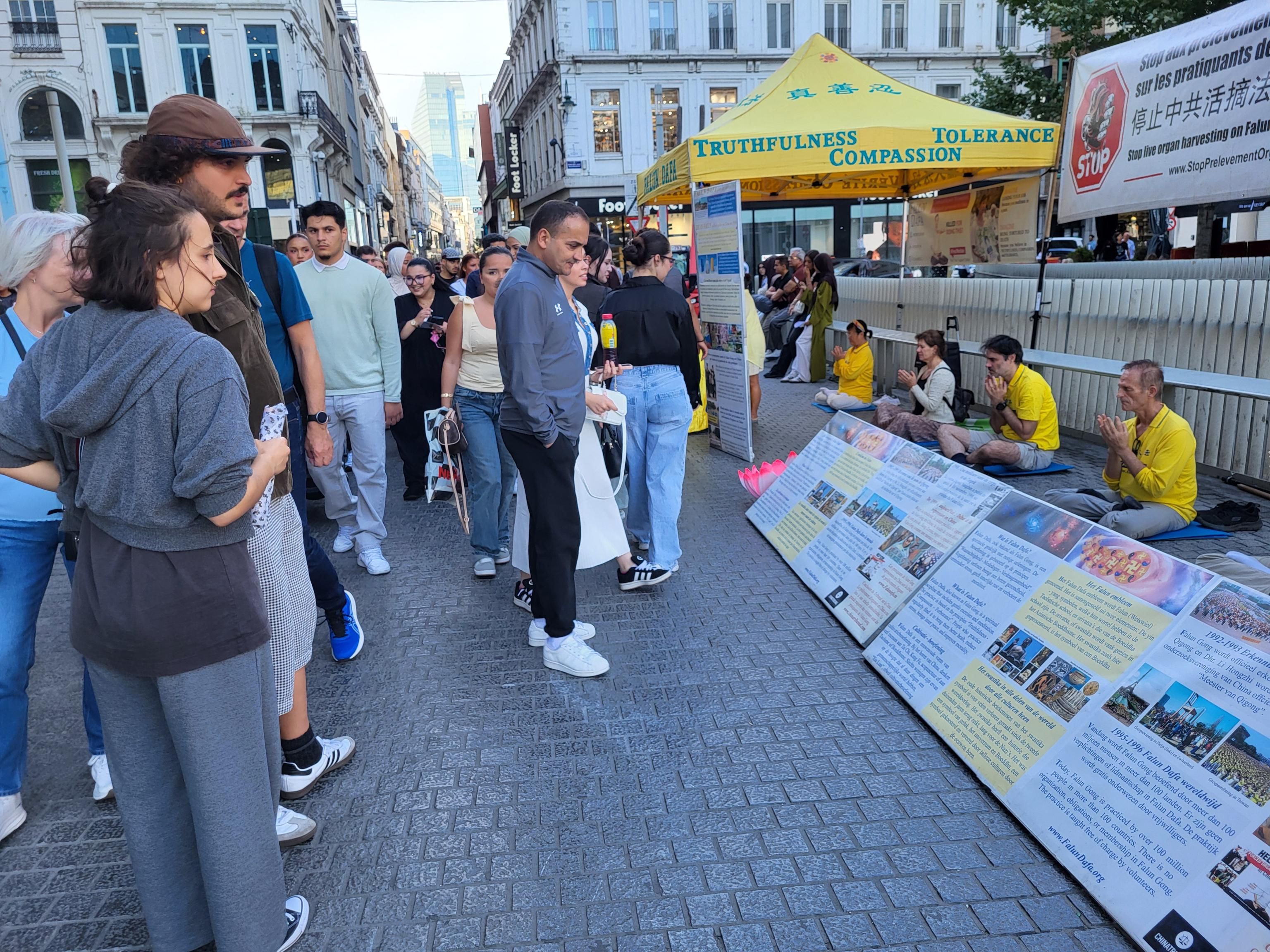 【明慧网二零二五年九月十日】(明慧记者唐容布鲁塞尔报道)二零二五年九月八日天气晴朗温和,布鲁塞尔(Brussels)市中心商业街行人如织。法轮功学员展示祥和的五套功法,和揭露中共活摘器官等真相展板和横幅,吸引了很多市民驻足观看和签名反对迫害。
