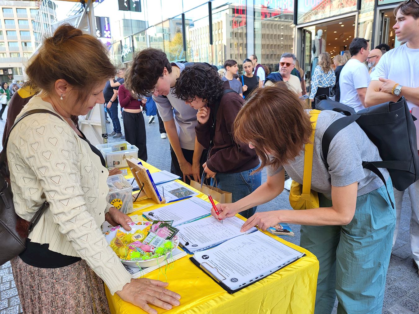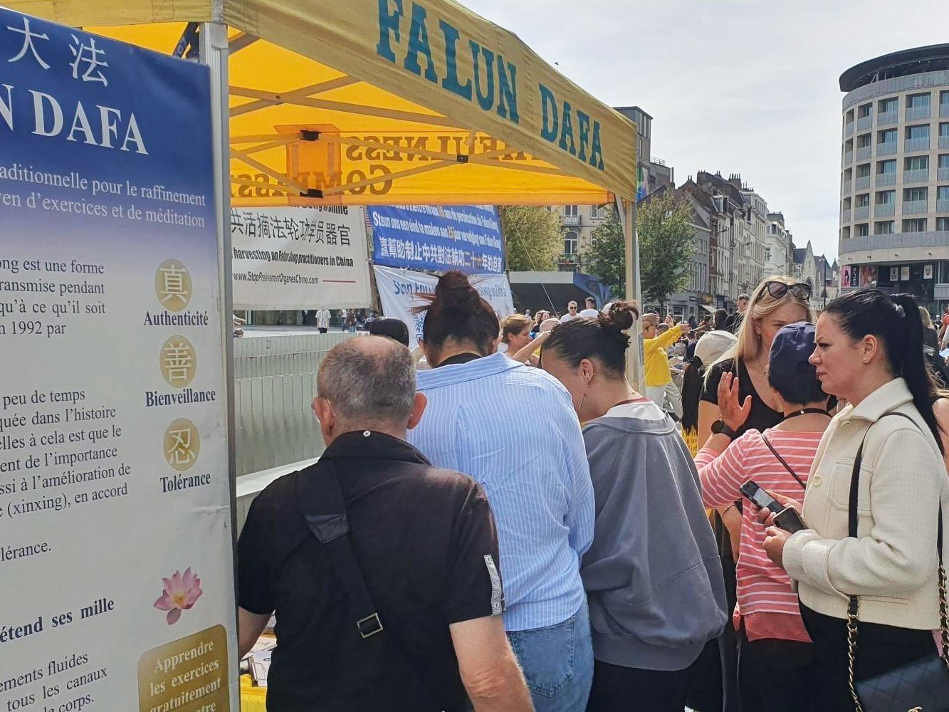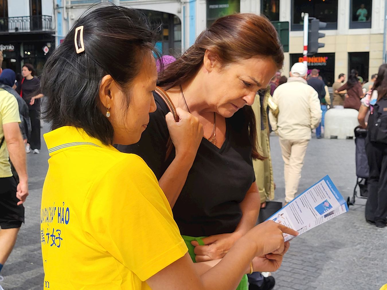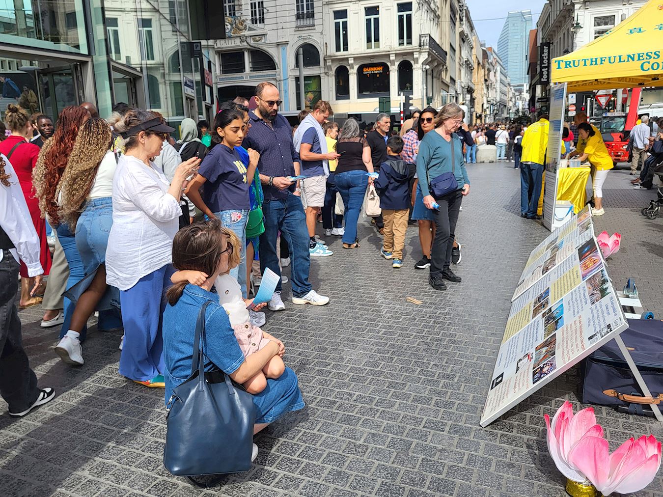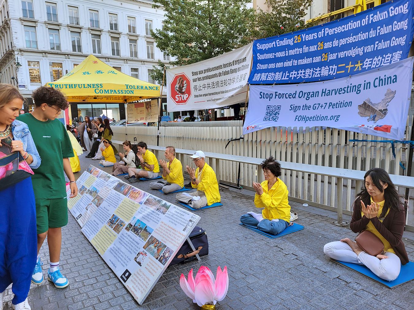 【明慧网二零二五年九月十日】(明慧记者唐容布鲁塞尔报道)二零二五年九月八日天气晴朗温和,布鲁塞尔(Brussels)市中心商业街行人如织。法轮功学员展示祥和的五套功法,和揭露中共活摘器官等真相展板和横幅,吸引了很多市民驻足观看和签名反对迫害。