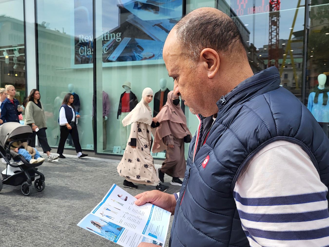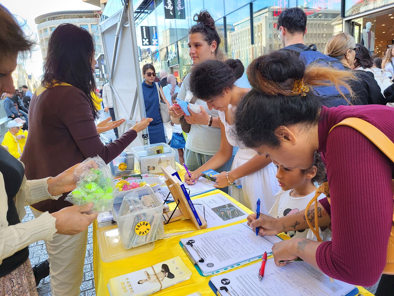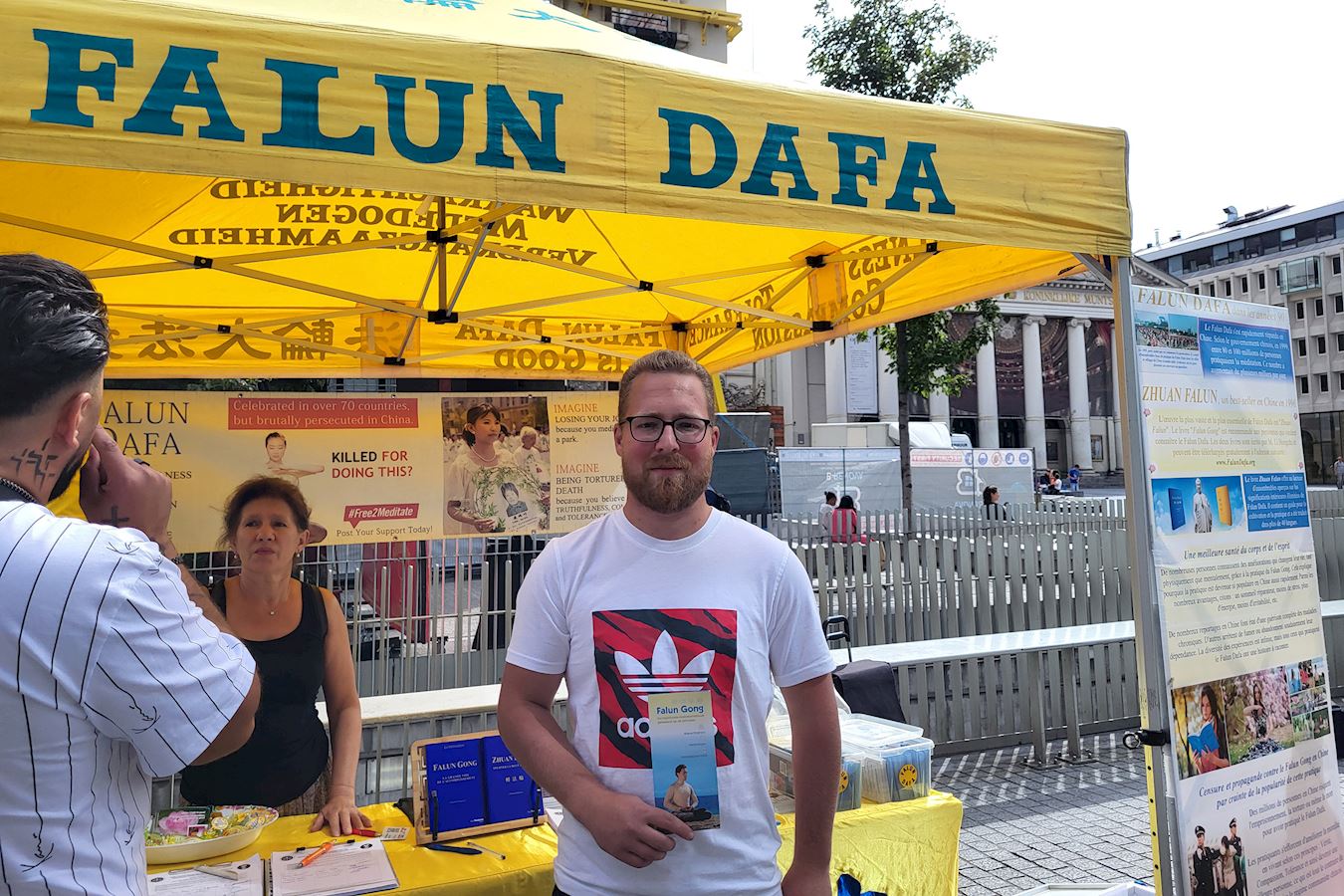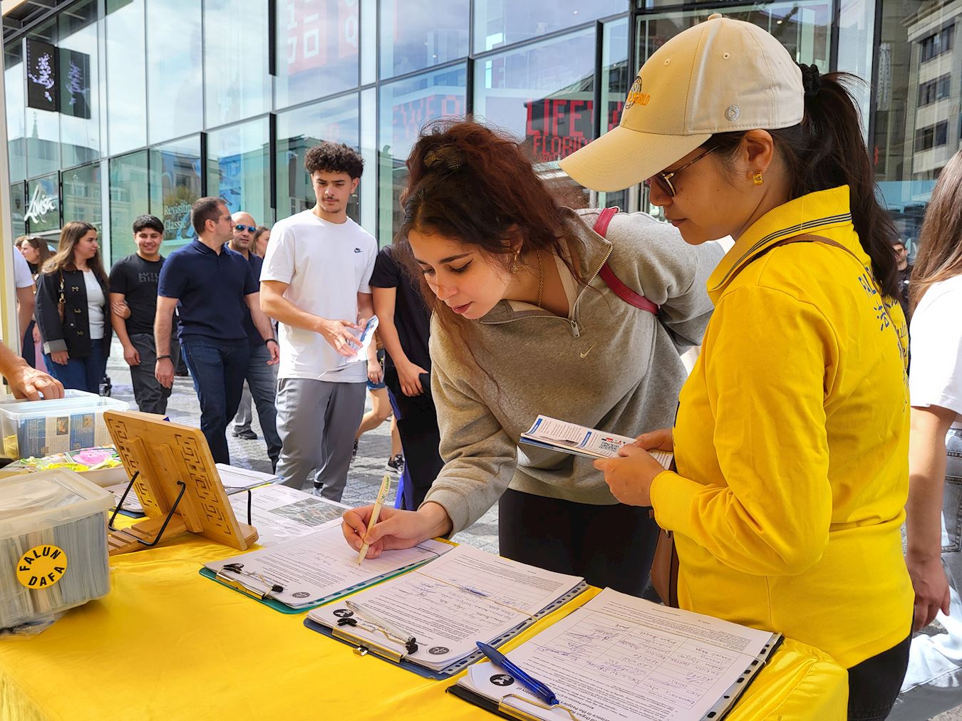 【明慧网二零二五年九月十日】(明慧记者唐容布鲁塞尔报道)二零二五年九月八日天气晴朗温和,布鲁塞尔(Brussels)市中心商业街行人如织。法轮功学员展示祥和的五套功法,和揭露中共活摘器官等真相展板和横幅,吸引了很多市民驻足观看和签名反对迫害。