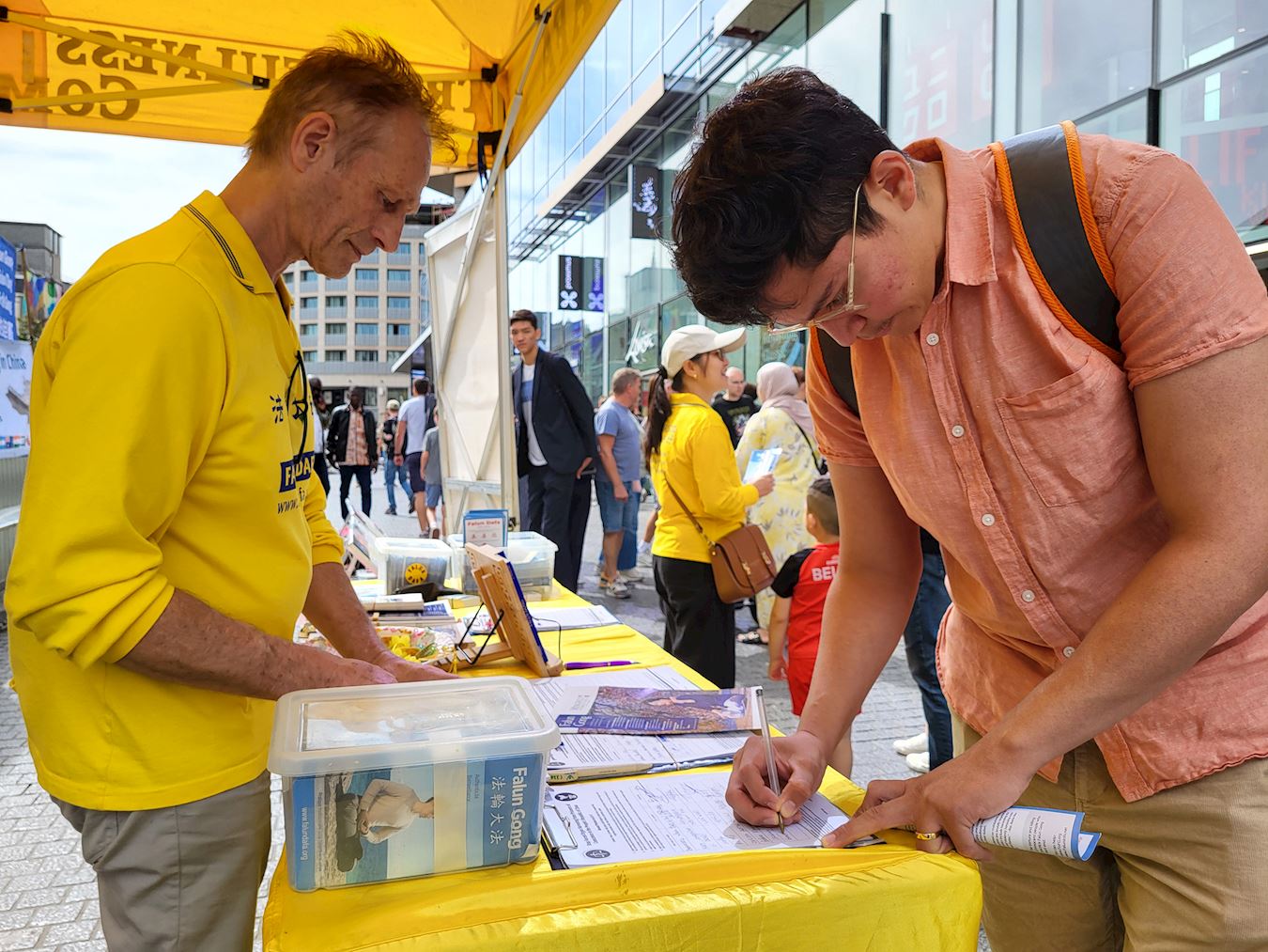 尼克拉斯(Nicolas)与学员交谈了解法轮功和迫害真相,并签名反活摘。