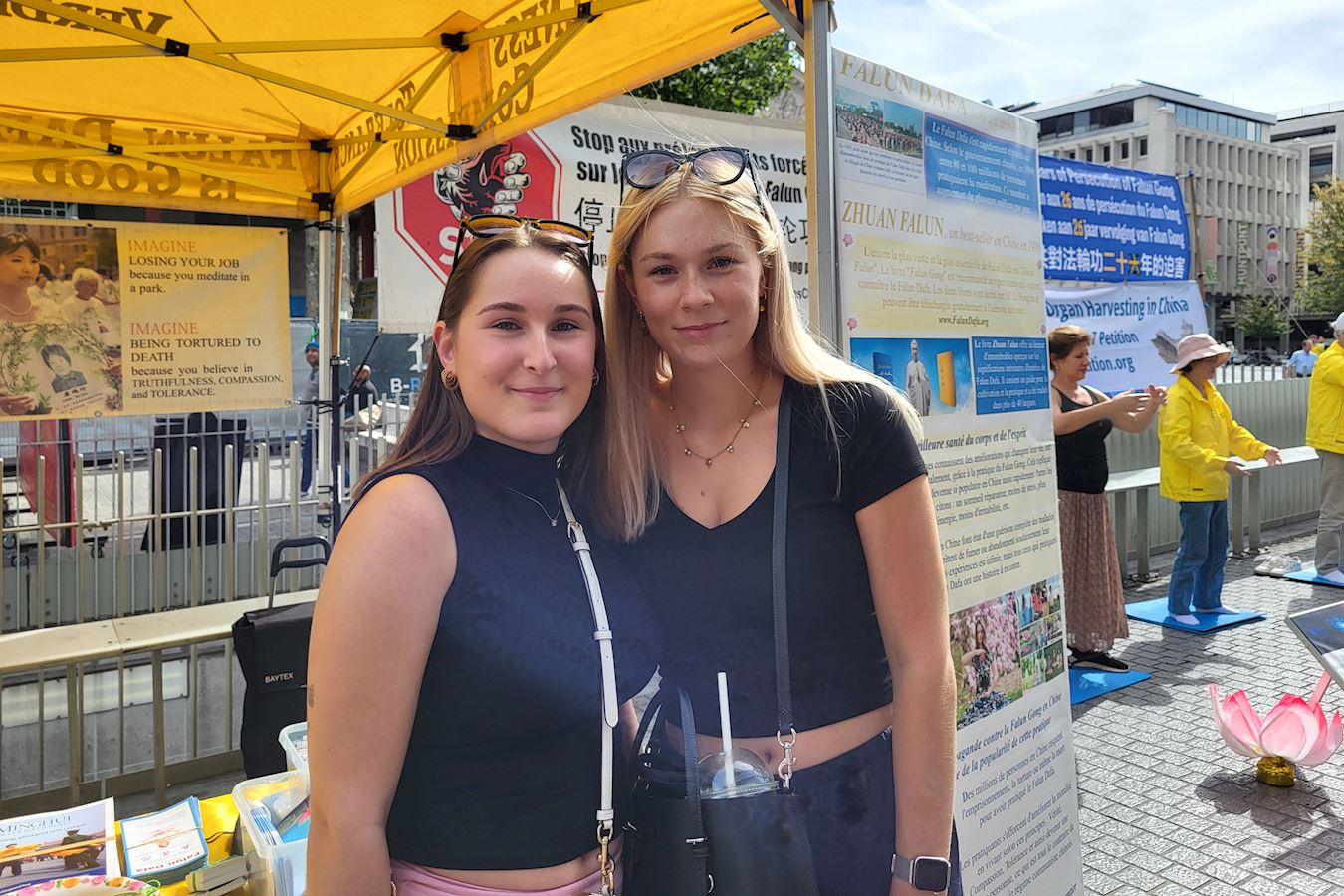 卡罗琳(Caroline)和费德里卡(Federica)被现场的功法演示和信息展示所吸引,交谈中表达了对法轮功学员的支持。“我从来没有听说过法轮大法,这是第一次了解。”卡罗琳表示,“他们在呼吁停止迫害,已经持续了二十六年,真的很震惊。”她说:“有很多人被关押,太可怕了。人们被杀害,只为了强取器官,这真的令人难以接受。”