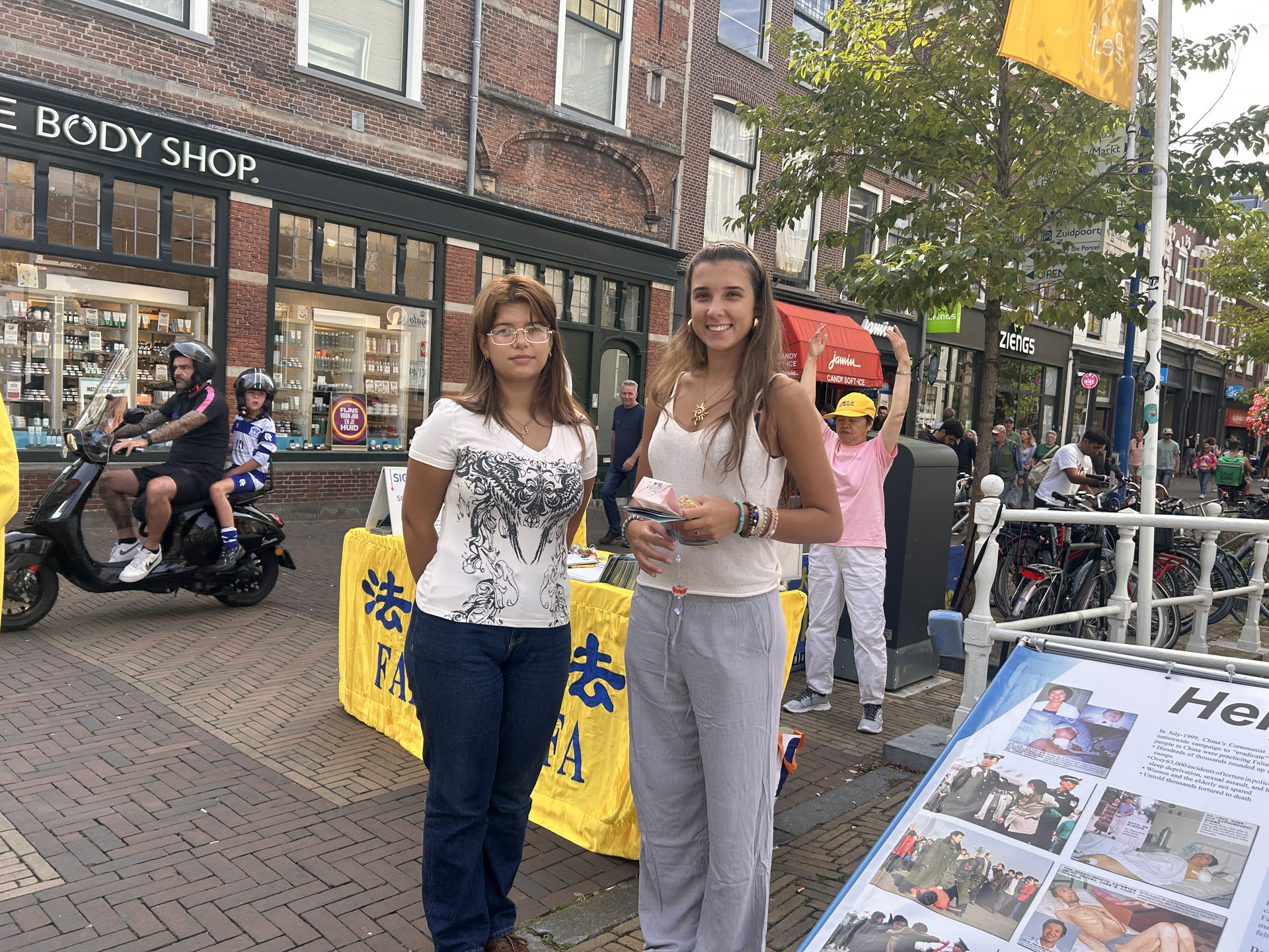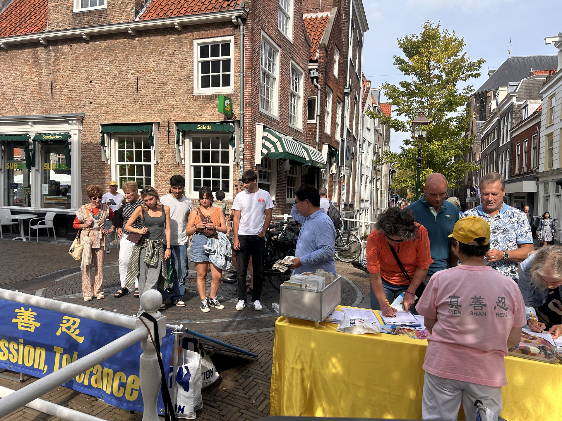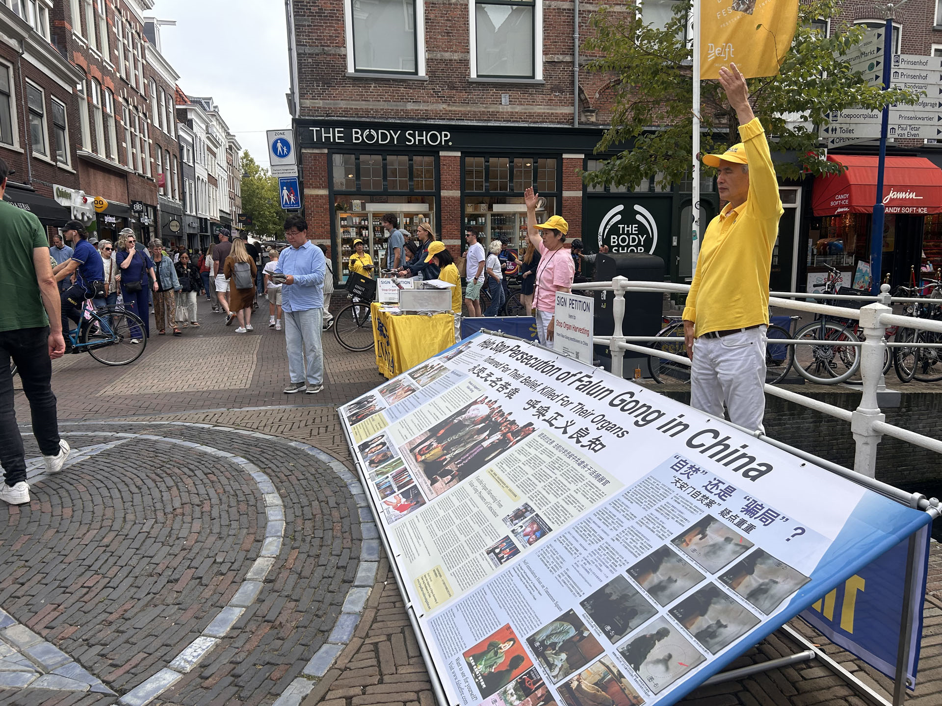 星期六中午,天气晴朗,湛蓝的天空中飘浮着祥云。代尔夫特市中心广场游客如织,法轮功学员在代尔夫特市新教堂东南侧运河边上布置展板,展示法轮功功法,发放传单,与民众交谈,吸引了很多民众。有中国留学生签名支持法轮功,还有很多游人被优美的法轮功功法吸引,迫切的询问在哪里可以学炼。