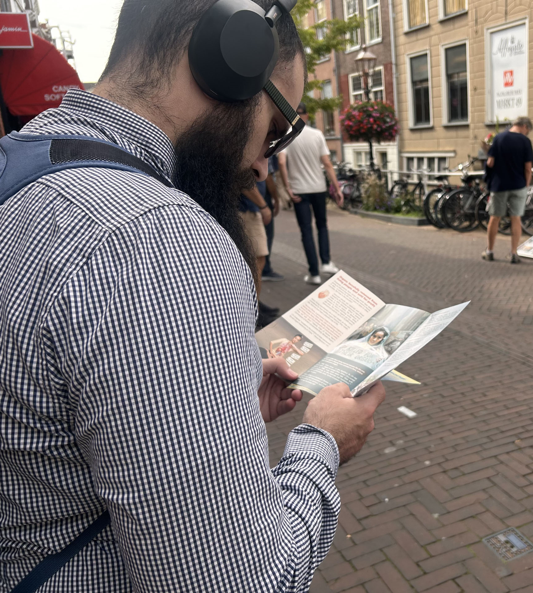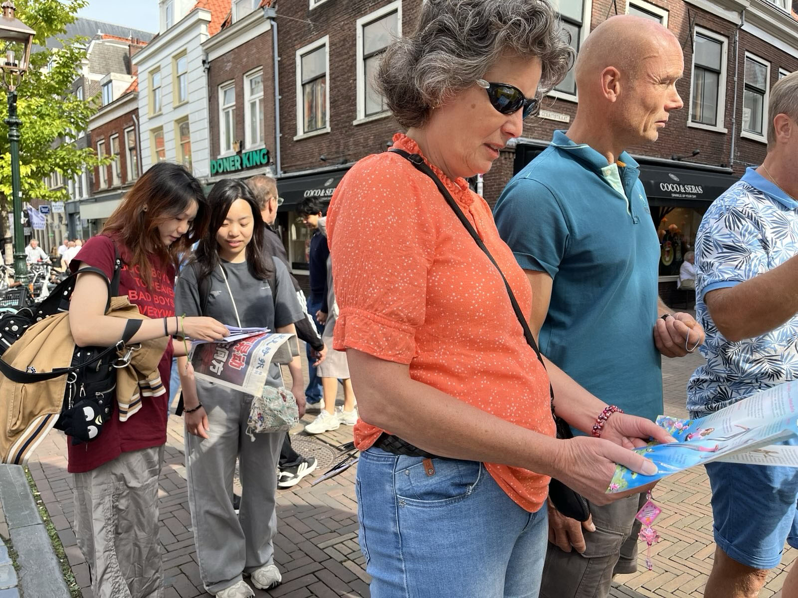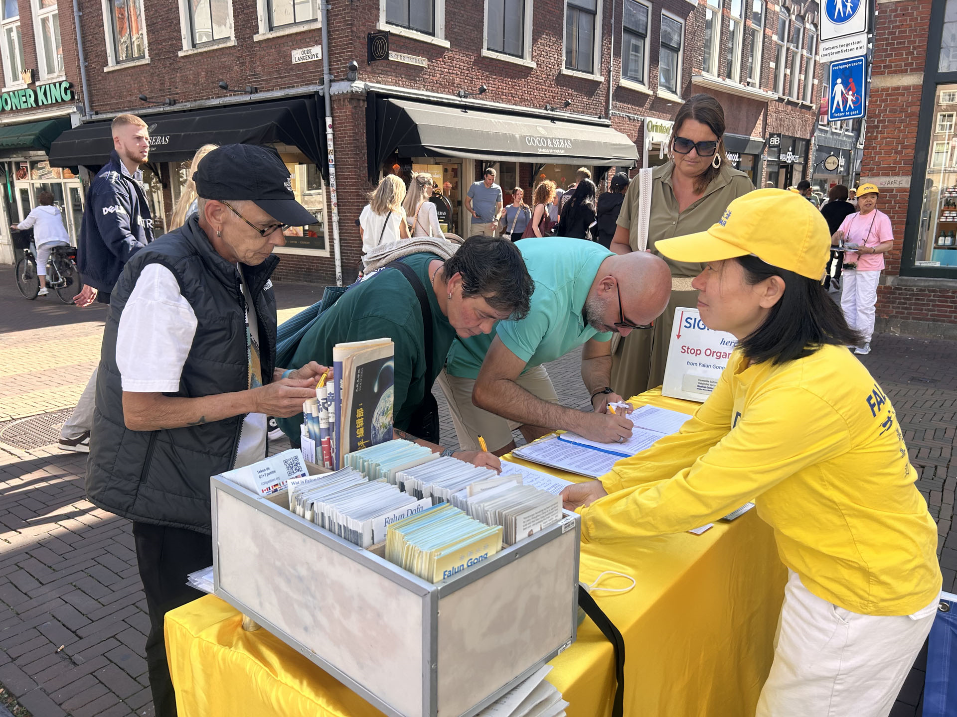 星期六中午,天气晴朗,湛蓝的天空中飘浮着祥云。代尔夫特市中心广场游客如织,法轮功学员在代尔夫特市新教堂东南侧运河边上布置展板,展示法轮功功法,发放传单,与民众交谈,吸引了很多民众。有中国留学生签名支持法轮功,还有很多游人被优美的法轮功功法吸引,迫切的询问在哪里可以学炼。