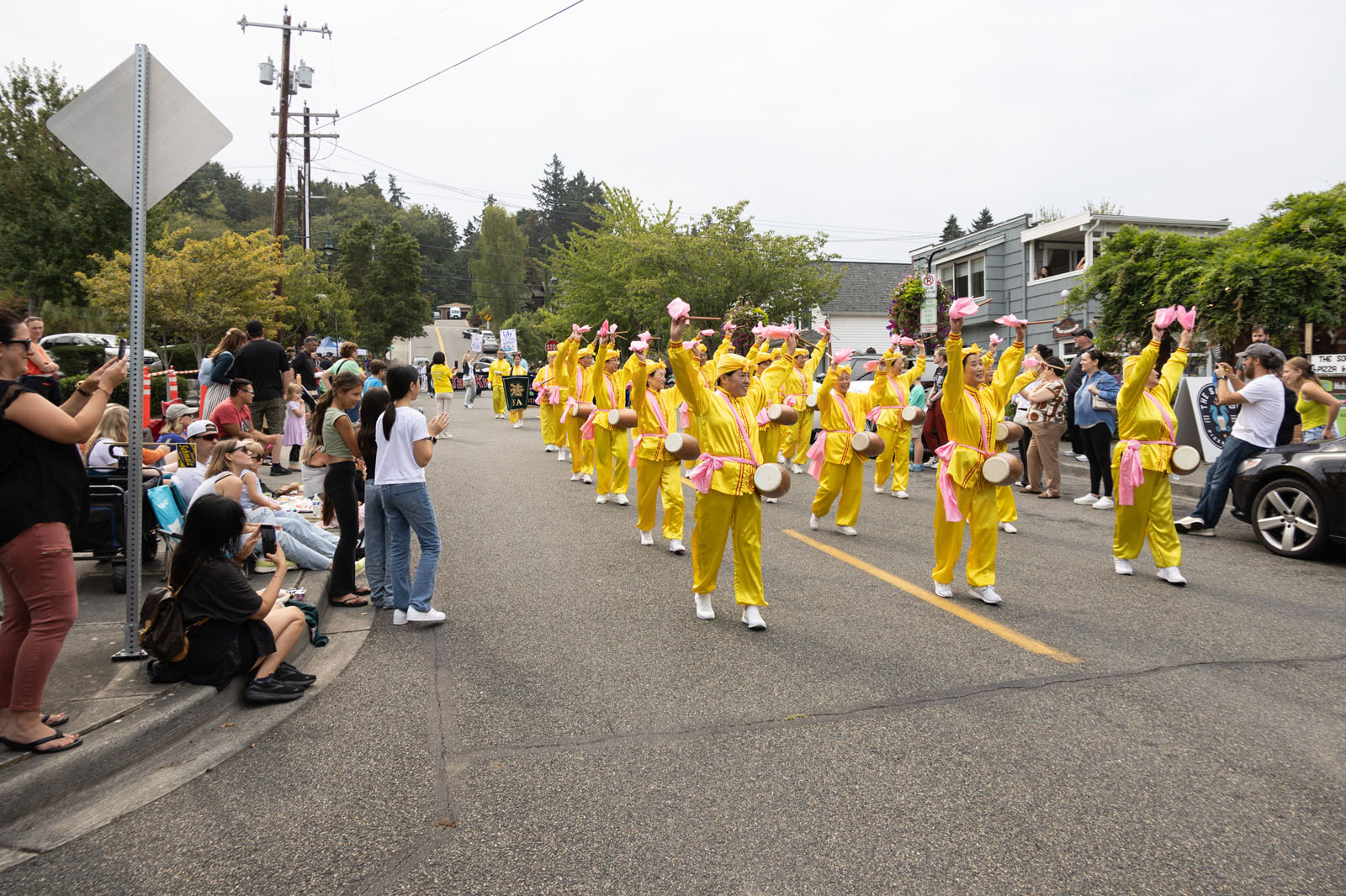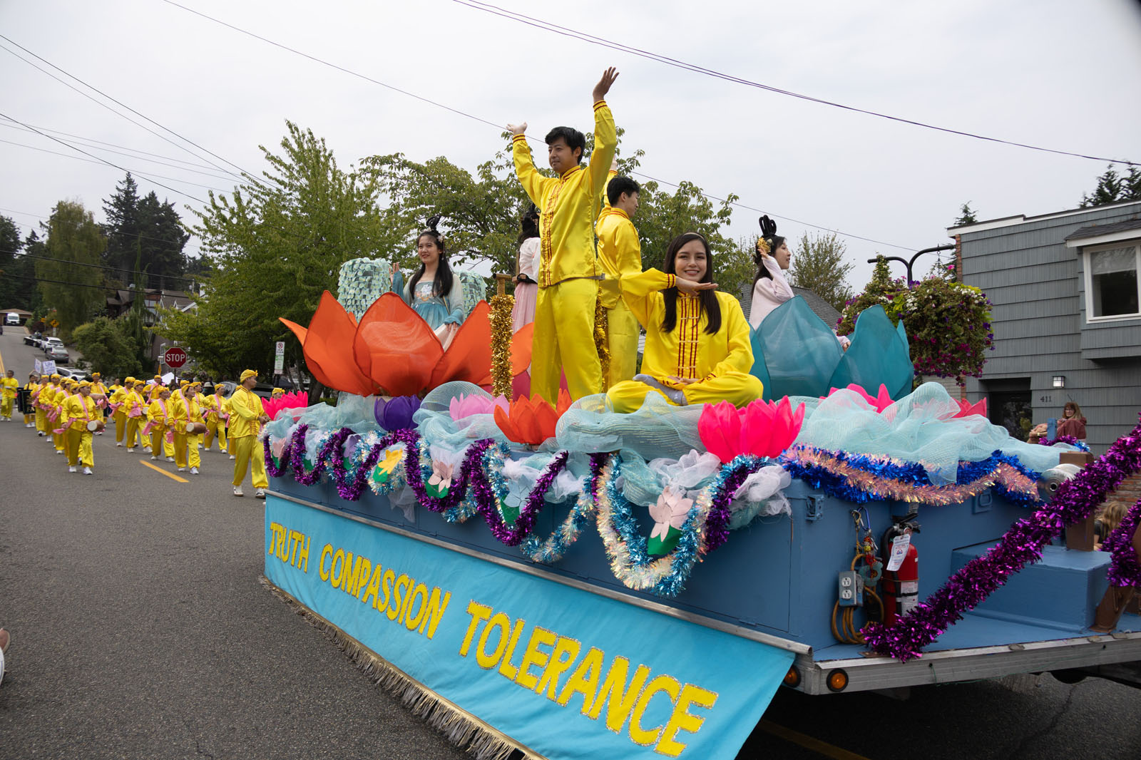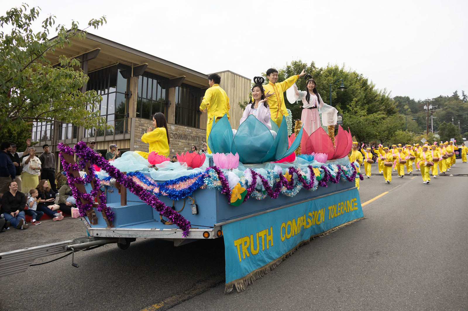 法轮功学员们带来了精心装饰的花车,向现场观众展示着祥和的法轮功功法;学员们也组成了腰鼓队,以中华传统艺术的表演和当地民众一起庆祝这个美好的节日,沿途有学员向现场观众传递法轮功的精美简介,受到观众非常热情的欢呼和鼓掌。