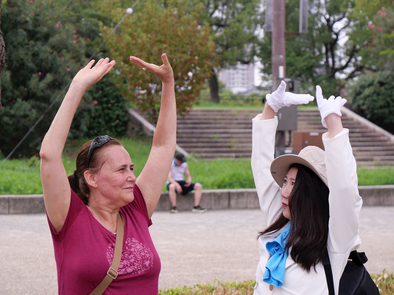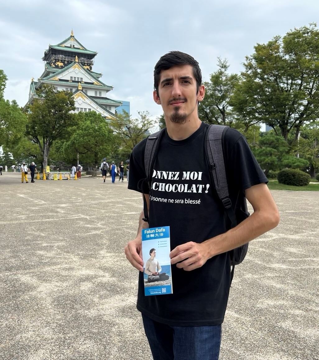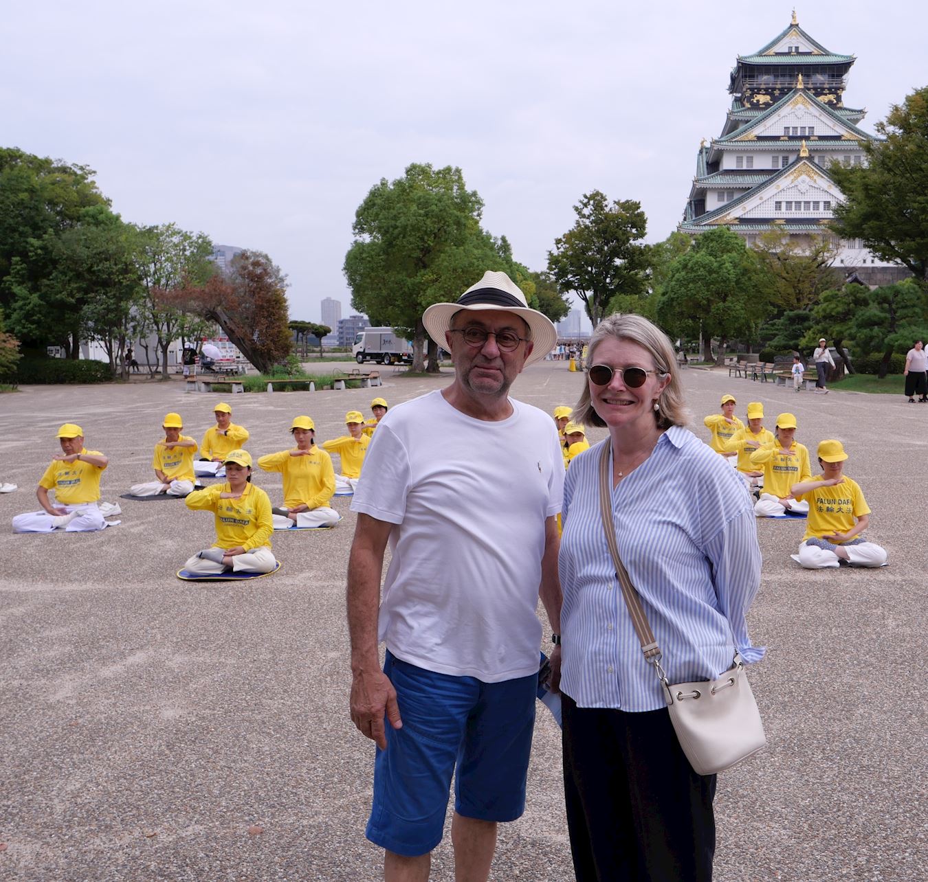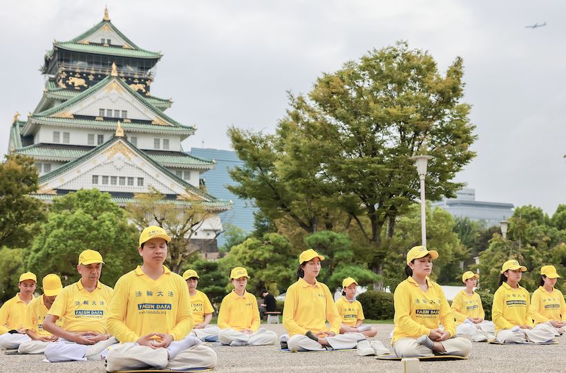 游行当天上午,法轮功学员分成多组在各大景点炼功。来自澳大利亚的罗恩(Ron)先生看到在著名景点大阪城公园炼功的法轮功学员,了解真相后表示:“非常认同真、善、忍的价值观,这真的非常重要。”